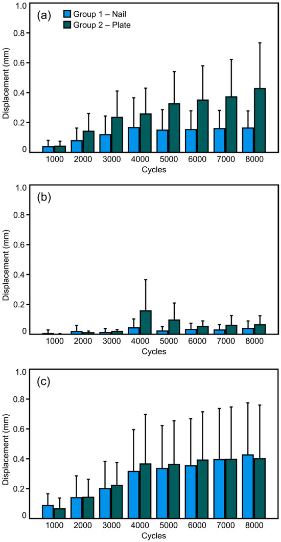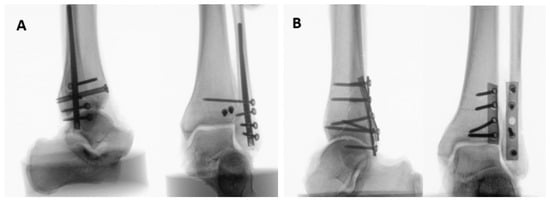 Background and Objectives: Ankle fractures are common and occur in up to 25% of cases with posterior malleolus (PM) involvement. The gold standard for their treatment considers posterior approaches and plating of both the PM and fibula. However, in elderly and comorbid patients, this strategy remains controversial. The objective of this biomechanical study was to compare a minimally invasive fixation—utilizing a fibula nail and percutaneous anteroposterior (AP) screws—versus double plating. Materials and Methods: An oblique fibula fracture associated with a Haraguchi type 1 PM fracture was reproduced in sixteen human cadaveric specimens randomized to two groups. Eight specimens were treated with a fibula nail plus two AP screws fixing the PM, while the remaining eight specimens underwent double plating. Biomechanical testing was performed under destructive complex cyclic loading applying a staircase protocol. Interfragmentary movements were captured via motion tracking. Results: Initial axial stiffness was similar between nailing (1125.9 ± 341.7 N/mm) and double plating (742.9 ± 600.1 N/mm) (p = 0.129). During cyclic testing, interfragmentary fibula displacement was higher for double plating versus nailing (p = 0.057), whereas PM displacement and syndesmosis diastasis remained comparable between the two techniques (p ≥ 0.197). Conclusions: The minimally invasive fixation of associated PM and fibula fractures utilizing a fibula nail and two anteroposterior screws demonstrated non-inferiority to double plating and presents a viable option in cases where delicate soft tissue management is required.