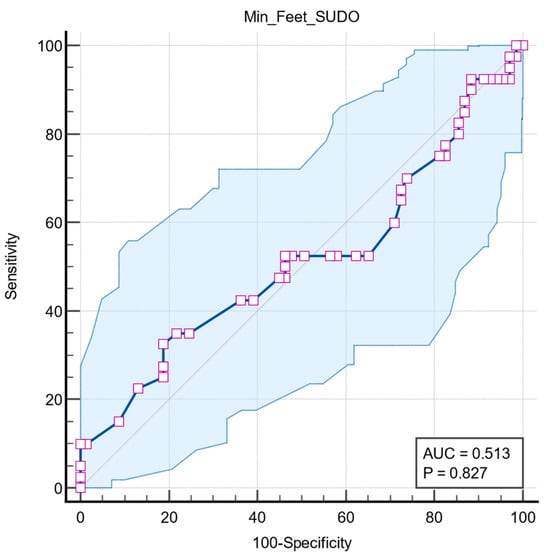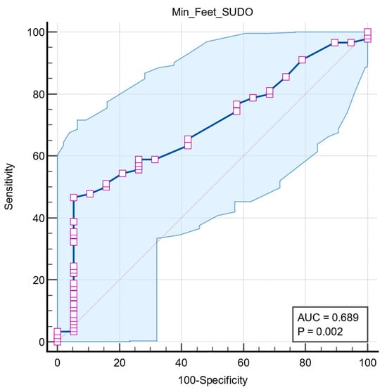Background/Objectives: Cardiac autonomic neuropathy (CAN) is a common but also underdiagnosed complication of diabetes mellitus (DM), associated with high cardiovascular risk and mortality. Sudomotor dysfunction can serve as an early indicator of autonomic dysfunction. This study evaluated the association between sudomotor dysfunction and the severity of CAN in patients with type 2 diabetes (T2D). Methods: In this cross-sectional study, 109 patients with T2D were evaluated for diabetic peripheral neuropathy, cardiovascular autonomic dysfunction, and sudomotor dysfunction. Additionally, clinical and biochemical data were collected from patients’ medical records. Results: Sudomotor dysfunction (SUDO+) was present in 59.6% of patients. The presence of SUDO+ was associated with a higher age, longer duration of diabetes, lower eGFR (estimated glomerular filtration rate) values, and more severe signs of peripheral neuropathy. SUDO+ patients showed significantly greater orthostatic systolic and diastolic BP (blood pressure) changes, lower RR interval ratios, and lower feet ESC (electrochemical skin conductance) values. ROC (receiver operating characteristic) analysis for feet ESC in identifying pathological RR ratio showed an AUC of 0.689 (95% CI: 0.593–0.774, p = 0.0022), with a sensitivity of 46.7% and a specificity of 94.7% at a cutoff of ≤68 µS. For orthostatic hypotension and QTc prolongation, the ESC values had limited discriminative power. Chi-squared analysis showed a significant association between feet sudomotor impairment and pathological RR ratio (χ2 = 6.521, p = 0.0107). Conclusions: Sudomotor dysfunction is associated with indicators of CAN. SUDOSCAN can be used as a complementary tool for early CAN detection in clinical practice.