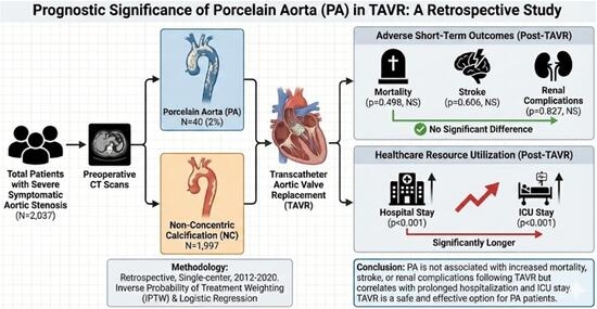 Background and Objectives: Patients with porcelain aorta (PA) pose major surgical challenges during aortic valve replacement, making transcatheter aortic valve replacement (TAVR) the preferred alternative. However, data on the prognostic significance of PA among TAVR recipients are limited. This study sought to