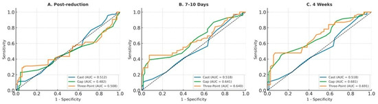 Background and Objectives: Distal radius fractures (DRFs) are among the most common upper-extremity injuries in the elderly, with malunion leading to long-term pain and disability. This study aimed to compare the discriminative performance of the Cast Index (CI), Gap Index (GI), and Three-Point Index (TPI) for predicting malunion during follow-up after closed reduction and casting in elderly patients with dorsally displaced DRFs. Materials and Methods: This study retrospectively analyzed 274 patients aged ≥65 years (mean 73.6 ± 6.5 years) with dorsally displaced Arbeitsgemeinschaft für Osteosynthesefragen/Orthopaedic Trauma Association (AO/OTA) 2R3A fractures treated conservatively between 2018 and 2023. Standard posteroanterior and lateral radiographs were evaluated immediately post-reduction, at 7–10 days, and at 4 weeks. Cast, Gap, and Three-Point Indices were measured independently by two observers, and the mean values were analyzed. Receiver operating characteristic (ROC) analysis was used to evaluate discriminative performance for the detection of malunion. Subgroup analyses were performed based on fracture stability according to La Fontaine criteria. Results: At the final follow-up, 136 fractures (49.6%) maintained acceptable alignment, while 138 fractures (50.4%) experienced malunion. There was no significant difference in radiographic parameters between groups immediately post-reduction or at 7–10 days. The Gap and Three-Point Indices were significantly higher in the malunion group at 7–10 days and at 4 weeks (p < 0.001), but the Cast Index showed no significant between-group difference. At 7–10 days, the Gap Index [Area Under the Curve (AUC) = 0.641; cut-off = 0.33] and the Three-Point Index (AUC = 0.640; cut-off = 1.51) demonstrated modest discriminative ability. In stable fractures, both indices were statistically significantly higher in the malunion group, whereas in unstable fractures, only the Three-Point Index was statistically significantly higher in the malunion group (p < 0.001). Conclusions: The Gap and Three-Point Indices showed greater discriminative ability than the Cast Index for malunion after conservative management of DRFs in elderly patients. Thresholds of GI ≥ 0.33 and TPI ≥ 1.51 at 7–10 days may serve as practical quantitative indicators to identify patients who may warrant closer follow-up and possible cast reassessment in conjunction with standard radiographic assessment and clinical judgment.