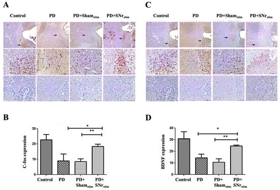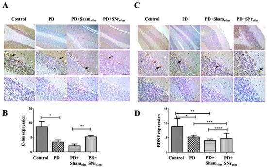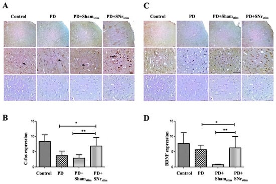 Background and Objectives: Parkinson’s disease (PD) is a neurodegenerative disorder marked by bradykinesia, rigidity, and tremor. While deep brain stimulation (DBS) of the subthalamic nucleus (STN) and globus pallidus internus (GPi) effectively alleviates motor symptoms, the potential of targeting the substantia nigra pars reticulata (SNr) is less understood. This study investigates the effects of mid-term DBS of the SNr on motor function and neuroplasticity in a 6-hydroxydopamine (6-OHDA) rat model of PD. Methods: Adult male Sprague-Dawley rats (280–300 g) were divided into healthy control (n = 10), PD (n = 9), sham-DBS (n = 7), and SNr-DBS (n = 7) groups. Bilateral striatal 6-OHDA lesions induced PD. High-frequency (130 Hz, 60 µs) SNr-DBS was delivered for 14 days. Locomotor activity (open-field), gait (footprint method), and motor coordination (rotarod) were assessed. Tyrosine hydroxylase (TH) expression in the SN and c-Fos and BDNF expression in the cerebellum, prefrontal cortex (PFC), and ventrolateral thalamus were analyzed histologically. Results: SNr-DBS significantly improved ambulation and horizontal activity compared to the PD group (p < 0.05). Gait analysis showed significant improvements in forelimb/hindlimb stride length and stance width, while rotarod performance indicated enhanced motor coordination (p < 0.05). Histology revealed increased TH expression in the SN and elevated c-Fos and BDNF levels in the cerebellum, PFC, and thalamus in the SNr-DBS group vs. PD rats (p < 0.05). Conclusions: Mid-term SNr-DBS produced significant functional gains in motor activity and coordination in a 6-OHDA PD model, together with molecular evidence of dopaminergic enhancement and neuroplastic activation. These translational findings suggest that targeting the SNr may offer a clinically relevant alternative for patients with PD, particularly for those who may not optimally respond to conventional STN or GPi stimulation.