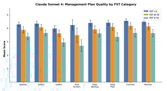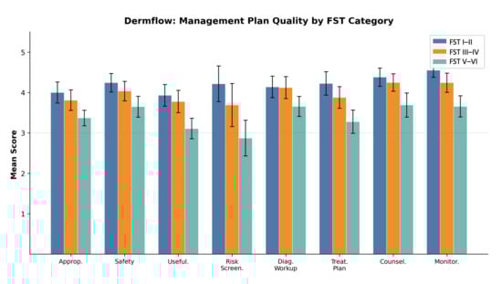 Background and Objectives: Shortages of dermatologists create significant barriers to care, particularly for inflammatory and history-dependent conditions where image-only artificial intelligence (AI) classifiers have limited applicability. Current teledermatology solutions largely focus on single-task, morphology-based neoplasm classifiers, leaving the vast majority of dermatologic presentations underserved. This study evaluated the diagnostic accuracy and management plan quality of Dermflow (Prava Medical, Delaware, USA), a proprietary dermatology-focused Multimodal Image-and-Data Assistant (MIDA) that autonomously gathers dermatology-specific history, integrates data with patient-submitted images, and outputs structured differential diagnoses and management summaries. Materials and Methods: Two AI systems, Dermflow and Claude Sonnet 4 (Claude, a leading vision–language model), analyzed 87 clinical images from the Skin Condition Image Network and Diverse Dermatology Images databases, representing 10 inflammatory dermatoses and 9 neoplastic conditions stratified across Fitzpatrick Skin Tone (FST) categories (I–II, III–IV, V–VI). For the diagnostic comparison, Dermflow received images and autonomously gathered clinical history, while Claude received identical images without history. For the management plan comparison, both systems received the correct diagnosis and the clinical histories gathered by Dermflow. The primary outcome was diagnostic accuracy. The secondary outcome was management plan quality, assessed by two blinded dermatologists across eight clinical dimensions using 5-point Likert scales. Chi-square tests compared diagnostic accuracy between models; t-tests and ANOVA compared management quality scores. Results: Dermflow achieved markedly superior diagnostic accuracy compared to Claude (86.2% vs. 24.1%, p < 0.001). Both models maintained consistent diagnostic performance across FST categories without significant within-model differences (Dermflow p = 0.924; Claude p = 0.828). Management plan quality showed no significant overall differences between models. However, composite management quality scores declined significantly for darker skin tones across both systems: Dermflow scored 4.20 (FST I–II), 3.99 (FST III–IV), and 3.47 (FST V–VI); Claude scored 4.35, 3.97, and 3.44, respectively (p < 0.001 for most pairwise FST comparisons within each model). Conclusions: Multimodal AI integrating targeted history with image analysis achieves substantially higher diagnostic accuracy than image-only approaches across both inflammatory and neoplastic dermatologic conditions. Autonomous history gathering addresses fundamental limitations of morphology-only classifiers and enables scalable, patient-facing triage across the full spectrum of dermatologic disease. However, both models demonstrated reduced management plan quality for darker skin tones despite receiving the correct diagnosis, suggesting persistent training data limitations that require targeted bias-mitigation strategies beyond domain-specific instruction.
