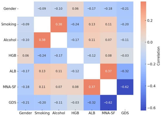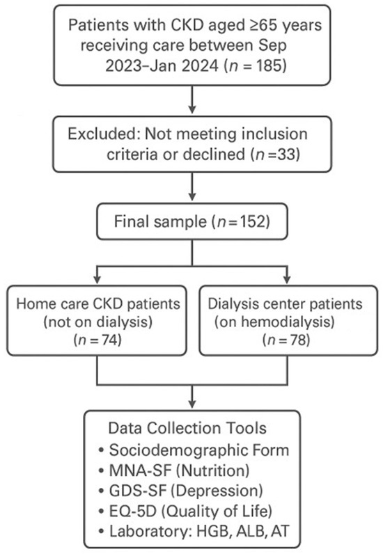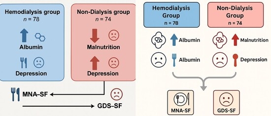 Background/Objectives: This study aimed to evaluate the interrelationship between depression and nutritional–metabolic status in geriatric patients with chronic kidney disease (CKD), and to identify the contributing clinical and sociodemographic factors, with a particular focus on differences between patients receiving and not receiving hemodialysis treatment. Methods: This cross-sectional descriptive study was conducted between September 2023 and September 2024 in Gaziantep, Turkey. A total of 152 CKD patients aged 65 years and older were included, with 78 receiving hemodialysis and 74 managed without dialysis. Nutritional status was assessed using the Mini Nutritional Assessment—Short Form (MNA-SF), and depression levels were measured using the Geriatric Depression Scale—Short Form (GDS-SF). Laboratory parameters such as hemoglobin and serum albumin were also recorded. Results: A total of 152 geriatric CKD patients were included, with 78 (51.3%) undergoing hemodialysis and 74 (48.7%) not receiving dialysis. The non-dialysis group had significantly higher age (77.07 ± 8.61 vs. 70.13 ± 7.76 years, p = 0.001) and BMI (28.44 ± 4.70 vs. 25.18 ± 4.75, p = 0.001). Serum albumin levels were lower in non-dialysis patients (2.53 ± 0.67 vs. 3.50 ± 0.465 g/dL, p < 0.001), while hemoglobin (12.44 ± 2.03 vs. 11.16 ± 1.92 g/dL, p = 0.001) and ALT levels (17.16 ± 13.06 vs. 8.53 ± 4.31 U/L, p = 0.001) were higher. Malnutrition was more frequent among non-dialysis patients (20.3% vs. 9.0%, p = 0.033). Although depression was more common in this group, the difference was not statistically significant (p = 0.091). A moderate negative correlation was observed between MNA-SF and GDS-SF scores (r = −0.426, p < 0.01). Serum albumin positively correlated with MNA-SF (r = 0.374, p < 0.01) and negatively with GDS-SF (r = −0.323, p < 0.01). Conclusions: Malnutrition was more frequent among elderly CKD patients not receiving hemodialysis, whereas depression prevalence did not differ significantly between groups. A significant correlation between nutritional status (MNA-SF, serum albumin) and depressive symptoms (GDS-SF) was observed in the overall CKD cohort, underscoring the close interplay between metabolic and psychological health in this population. These results highlight the need for routine screening and integrated management of both nutrition and mental health in elderly CKD patients, and future longitudinal studies are warranted to determine causal pathways and predictive value. Full article