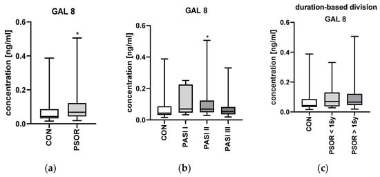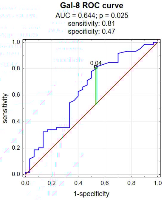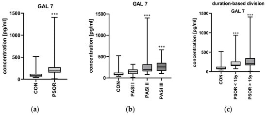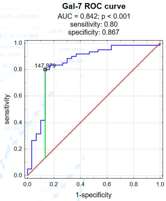 Background: Psoriasis is a chronic, immune-mediated skin disorder characterized by accelerated epidermal turnover. Galectins are a family of carbohydrate-binding proteins that play crucial roles in various biological processes. Methods: This study aimed to assess the plasma concentrations of galectin 7 and 8 (gal-7 and 8) in 60 psoriatic patients compared to the control group of 30 individuals without dermatoses. Results: The median gal-7 plasma concentration in patients was 188.8 (11.43–1406) pg/mL, and it was significantly higher than in controls (p < 0.001). There was a positive correlation between gal-7 concentration and psoriasis area and severity index (PASI; R = 0.3, p = 0.0199), and a negative with RBC (R = −0.41, p < 0.001), hemoglobin concentration (R = −0.34, p < 0.01), total cholesterol (R = −0.38, p < 0.01) and LDL concentration (R = −0.36, p < 0.05). In contrast, gal-7 was not correlated with psoriasis duration or patients’ age or sex (p > 0.05). The median gal-8 plasma concentration in patients was 0.07 (0.02–0.5) ng/mL, and was significantly higher in patients than controls (p < 0.05). There was a positive correlation between gal-8 concentration and glucose concentration (R = 0.26, p < 0.05). Gal-8 concentration was not correlated with PASI, BMI, age or sex of patients (p > 0.05). We also analyzed the receiver operating characteristic (ROC) curve to evaluate the predictive power of gal-7 and 8 for psoriasis. Gal-7 achieved statistical significance in predicting psoriasis and had an area under the curve (AUC) value of 0.842 (p < 0.001), a sensitivity of 80%, and a specificity of 86.7%, whereas gal-8 had an AUC value of 0.644 (p = 0.025), a sensitivity of 81%, and a specificity of 47%. Conclusions: Gal-7 and gal-8 could potentially serve as psoriasis biomarkers, whereby gal-7 could also serve as a marker of its severity. Future studies are needed to clarify their actual role or potential as therapeutic targets in psoriasis. Understanding their precise functions may open new perspectives for personalized treatment strategies in psoriatic patients.