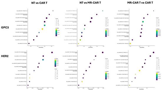Background/Objectives: Chimeric antigen receptor (CAR) T cells are a powerful cancer therapy, but their function depends heavily on internal signaling domains and metabolic adaptability. Most studies evaluate CAR behavior upon antigen exposure, yet intrinsic signaling properties may pre-program CAR T cell states even in the absence of stimulation. This study investigates how CAR design and metabolic support shape baseline transcriptional programs, focusing on tonic signaling and NF-κB-related pathways. Methods: We engineered CAR T cells targeting HER2 or GPC3 antigens, incorporating either 4-1BB or CD28 co-stimulatory domains, respectively. A subset of cells was further modified with adenosine deaminase 1 (ADA1) and CD26 to degrade extracellular adenosine and supply inosine, a metabolic strategy termed metabolic refueling (MR). Bulk RNA-seq was performed on resting T cells without antigen stimulation. We analyzed differential gene expression, gene set enrichment (GO, KEGG, Hallmarks), and transcription factor activity (DoRothEA) to assess the impact of CAR design and MR on T cell programming. Results: All CAR T cells exhibited activation of NF-κB–centered inflammatory programs at baseline, indicating tonic signaling. GPC3 CAR T cells showed stronger baseline activation than HER2 CAR T cells. Metabolic refueling amplified these programs without altering their directionality, enhancing inflammatory, survival, and effector modules. Transcription factor activity scores mirrored these trends, highlighting RELA, FOS, and STATs as key regulatory nodes. Conclusions: CAR-intrinsic features, notably co-stimulatory domain choice, define the tonic NF-κB activation tone in resting CAR T cells. Metabolic refueling boosts these baseline states without overstimulation, suggesting it may be especially valuable for weaker CAR constructs. These findings provide a framework for tuning CAR T cell function through combinatorial design strategies targeting signaling and metabolism.