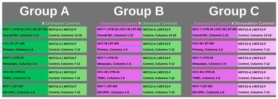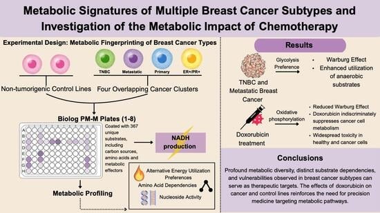 Background/Objectives: Breast cancer is a prevalent and heterogeneous disease with multiple subtypes, which are defined by characteristics such as molecular biomarkers and metastatic status. This study aimed to profile the metabolic activity of various breast cancer subtypes, both with and without chemotherapy (doxorubicin) application. Methods: Six human breast cell lines were evaluated, two non-tumorigenic controls and four cancerous lines. The cancer lines were clustered as primary-derived, metastasis-derived, triple-negative (TNBC), and strong hormone receptor-positive (ER+/PR+) and analyzed using the Biolog phenotype mammalian microarrays (PM-M1 to PM-M8) to assess metabolic activity via NADH production under a wide array of substrate parameters. Results: Unique metabolic profiles emerged across the subtypes and clusters; the TNBC and metastatic cells demonstrated enhanced utilization of glycolytic and anaerobic substrates consistent with the Warburg effect. The ER+/PR+ cells showed heightened glucose utilization and unique sensitivity to metabolic effectors and doxorubicin. Additionally, significant metabolic differences were observed in nucleoside and amino acid utilization between cancer and control cells, particularly in metastatic and TNBC lines. Conclusions: Our findings reveal the profound metabolic diversity among breast cancer subtypes and highlight distinct substrate dependencies for proliferation. The results additionally provide a framework for developing metabolic biomarkers and targeted therapies for chemotherapy resistance in breast cancer subtypes.