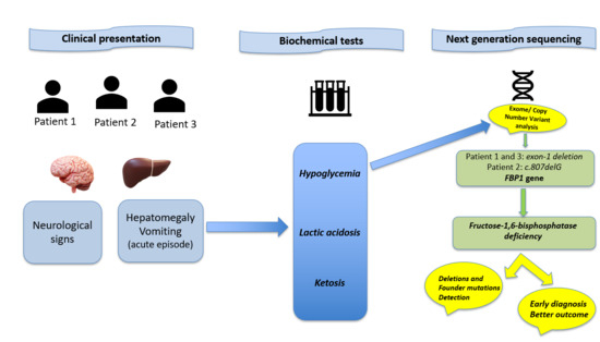 Background: Advances in genomic technologies combined with tandem mass newborn screening have enabled early detection and management of several common inborn errors of metabolism. Fructose-1,6-bisphosphatase deficiency, an autosomal recessive treatable disorder reported in around 150 patients worldwide, remains underdiagnosed despite an excellent prognosis with early detection. Although common in highly consanguineous populations, diagnosis is often delayed due to the non-specific clinical and biochemical profile. Methods: This report explores the diagnostic pathway using first-tier next-generation sequencing of three novel cases of fructose-1,6-bisphosphatase deficiency in a tertiary care center in Lebanon. Results: Two patients were diagnosed with first-tier exome sequencing within one month of presentation and had an excellent outcome at 6 years of follow-up. The third patient, undiagnosed for 10 years, suffered from neurological sequalae. The molecular profile was remarkable in two patients for exon 2 deletion in the FBP1 gene, a founder mutation reported in Turkish and Armenian patients, and a rare frameshift mutation in the third case. Conclusions: The use of next-generation sequencing as as a first-tier test for FBP deficiency is a non-invasive and rapid method for early diagnosis and management of this rare yet treatable disorder. It can detect both disease-causing variants and large deletions, founder mutations as well, delineating the molecular profile in populations where this disorder is highly prevalent.