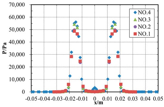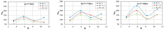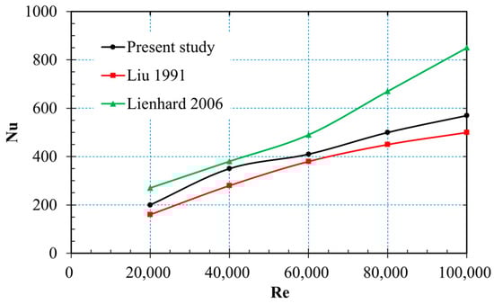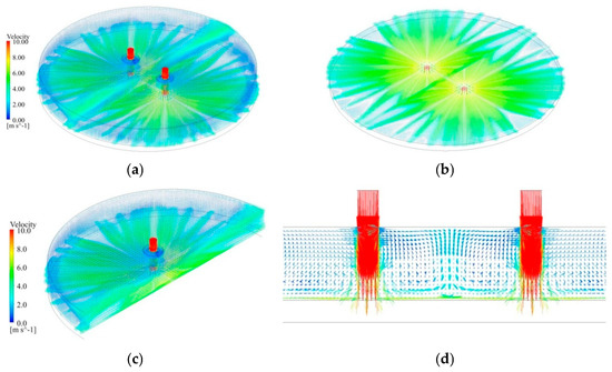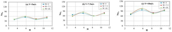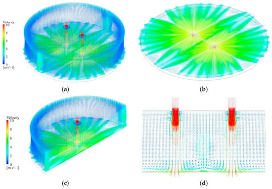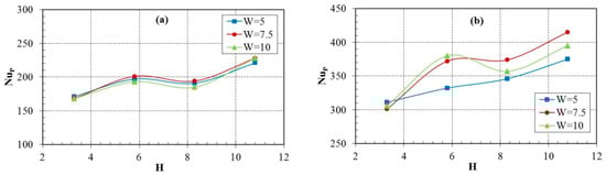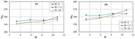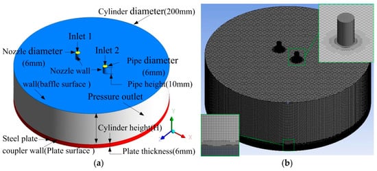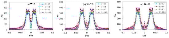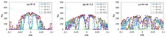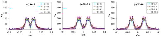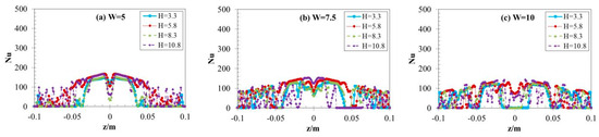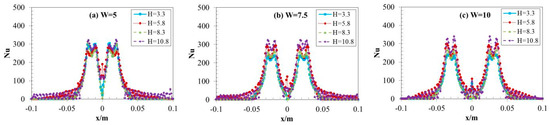 The flow dynamics and heat transfer of dual vertical water jets impinging a high-temperature steel plate were numerically investigated using a three-dimensional model. A systematic parametric investigation was conducted by varying key operating conditions: including the jet velocity at the nozzle exit (V = 5 m/s, 7.5 m/s, 10 m/s), the non-dimensional nozzle-to-plate distance (H = h/d = 3.3, 5.8, 8.3, 10.8), and the non-dimensional spacing between twin nozzles (W = w/d = 5, 7.5, 10). Upon impingement, multiple wall-jet flows formed on the steel plate surface, with their radial spread distance increasing along the plate’s surface. A wall-jet interaction zone developed between the two jets, accompanied by a linear fountain upwash flow. To depict the thermal and hydrodynamic characteristics, the distributions of the local Nusselt number and flow velocity vectors were examined. Findings suggest that fluctuations in W have little impact on the mean Nusselt number. Nevertheless, a growth in H brings about a concurrent increase in the Nusselt number of the stagnation point on the plate’s surface. Furthermore, the results indicate that W is a primary factor controlling the heat transfer rate within the interaction zone of the opposing wall jets.