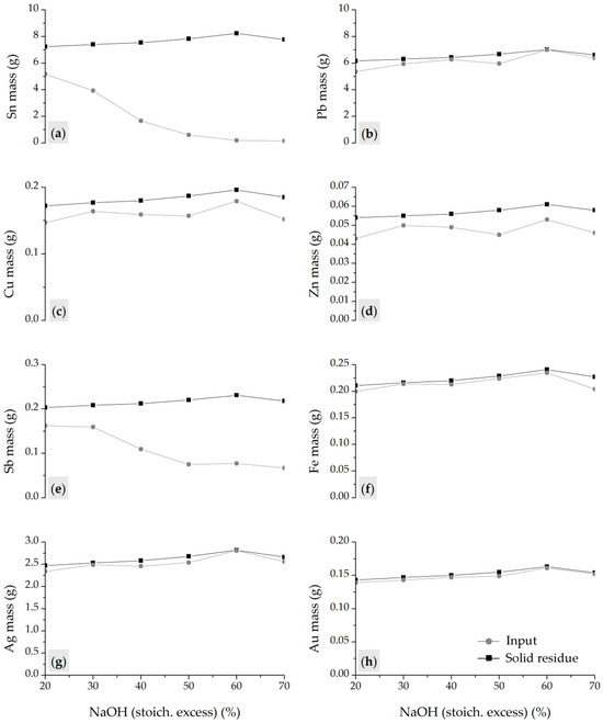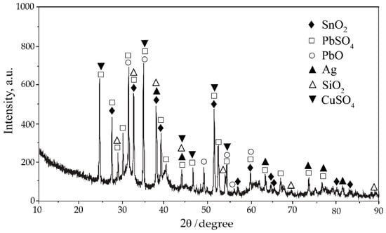Copper anode slime (CAS), obtained from non-standard anodes by pyro-hydrometallurgical electronic waste (e-waste) processing, contains high concentrations of lead, tin (as metastannic acid), and base (Cu, Fe, Zn), precious (Au, Ag), and technological metals (In, Ga, Ge), which limit the efficiency of conventional valorization methods. In this study, an integrated alkali fusion–leaching process was applied to non-standard CAS. Thermodynamic modeling defined the key parameters for selective phase transformations and efficient metal separation. These parameters were experimentally investigated, and the optimized fusion conditions (CAS:NaOH = 40:60, 600 °C, 60 min), followed by water leaching (200 g/dm3, 80 °C, 60 min, 250 rpm), resulted in >97% Sn removal efficiency. Simultaneously, Au and Ag losses were negligible, resulting in solid residue enrichment. Oxidant addition (NaNO3) did not improve Sn removal but increased Fe, Pb, and Ag solubility, reducing selectivity. The scaled-up test confirmed process reproducibility, achieving 97.75% Sn dissolution and retention of precious metals in the PbO-based residue (99.99% Au, 99.78% Ag). Application of an integrated thermodynamic modeling, laboratory optimization, and scaled-up validation approach to non-standard CAS provides a relevant framework for a selective, efficient, and scalable method addressing industrial needs driven by increased e-waste co-processing, contributing to sustainable metal recovery.