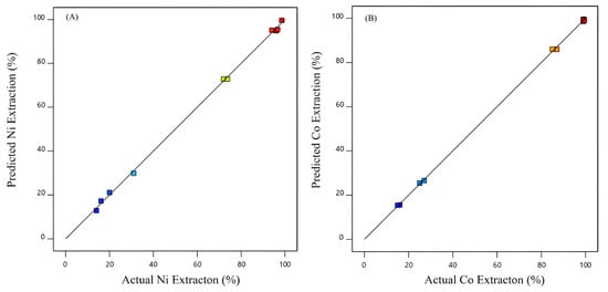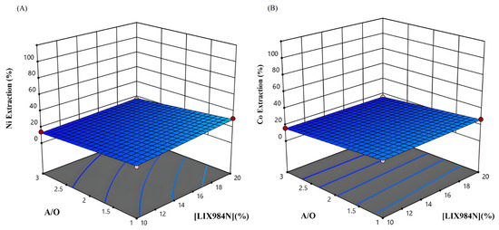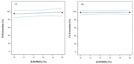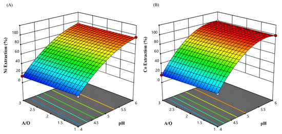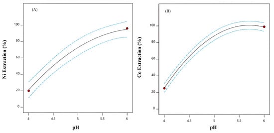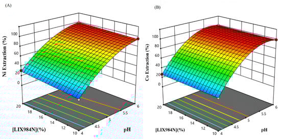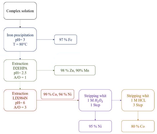 The extraction and stripping of Co, Ni, Mn, and Mg ions from raffinate solution of the Sarcheshmeh copper complex containing Cu (0.14 g/L), Ni (0.15 g/L), Co (0.06 g/L), Fe (10.72 g/L), Zn (2.4 g/L), Mn (4.83 g/L), and Mg (8 g/L) was comprehensively studied using D2EHPA and LIX 984 extractants. To design the solvent extraction experiments, the response surface method (RSM) was employed. The optimal and most efficient conditions and extraction rates of nickel and cobalt were considered for the application of a central composite design (CCD). The design of experiments (DOE) was carried out using three operating variables: the equilibrium pH of the solution (4–6), extractant concentration (10–20%), and aqueous-to-organic phase ratio (1–3). The results indicated that the highest extraction of Co and Ni occurred within 5 min at a mixing speed of 500 r/min and 40 °C. The results showed that the equilibrium pH of the aqueous solution had a greater influence on nickel and cobalt extraction than the other parameters. According to the research results, 99% of cobalt and 94% of nickel were extracted simultaneously under optimum conditions of pH = 6, [LIX984N] = 10%, and A/O = 3. In the stripping stage, 95% of nickel ions were recovered in one step using 1 M sulfuric acid, and 80% of cobalt ions were recovered in three steps using 5 M hydrochloric acid. Finally, 98% of Zn, 99% of Co, and 94% of Ni were extracted in two stages with D2EHPA and LIX984N extractants.