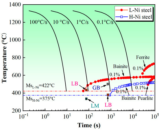 The effect of Ni content on the improvement of low-temperature impact toughness and microstructure refinement in a simulated coarse-grained heat-affected zone (CGHAZ) of high-strength steel was studied. The impact toughness tests revealed that as the heat input increased from 20 to 50 kJ/cm, both low-nickel (L-Ni) steel and high-nickel (H-Ni) steel exhibited a rapid decline in the impact toughness of their coarse-grained heat-affected zones (CGHAZ), though the H-Ni steel consistently demonstrated significantly higher impact toughness than the L-Ni steel. Microstructural characterization showed that the microstructure of L-Ni steel gradually transitioned from lath bainite (LB) to granular bainite (GB) with increasing heat input, which accounted for its reduced impact toughness. Conversely, H-Ni steel underwent a phase transformation from lath martensite (LM) to LB with increasing heat input, showing an unexpected trend opposite to the conventional understanding of toughness enhancement. Notably, the martensitic structure obtained in H-Ni steel at 20 kJ/cm exhibited substantially higher impact energy (59.6 J) than both the LB structures of L-Ni steel (44.6 J) and those of H-Ni steel (37.8 J) observed at 20 and 50 kJ/cm heat inputs. This phenomenon is attributed to the increased Ni content significantly refining the packet of LM, thereby enhancing its resistance to brittle crack propagation. Although LB structures obtained under different conditions exhibited refined blocks, their parallel arrangement within coarse packets resulted in less effective obstruction of brittle crack propagation compared to the refined packet with interlocking arrangement.