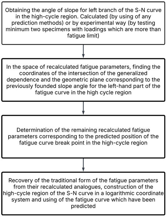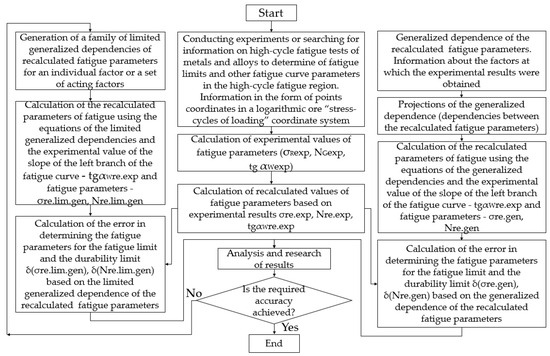 Under cyclic loading, almost immediately after its onset, a surface layer forms where hardening and softening processes occur. The interaction of plastic deformation traces with each other, and with other structural elements, leads to the formation of a characteristic microstructure on the surface of a component subjected to cyclic loading. The set of factors (conditions) acting during cyclic loading determines the nature of slip band accumulation, the integral structurally sensitive fatigue parameter, expressed as the slope of the left side of the fatigue curve linearized in logarithmic coordinates, and the location of the breaking point on the fatigue curve in the high-cycle region. A combined review of numerous data on the fatigue of metals, obtained under various combinations of factors, and the generalization of these results through a normalization procedure for obtaining the relative (recalculated) parameters of fatigue, allows us to derive a universal method for “S-N” curve prediction. However, extensive generalization decreases the prediction accuracy for specific cases; therefore, it is proposed to form limited generalized dependencies corresponding to specific operating conditions. This paper evaluates the accuracy of fatigue limit prediction using generalized and limited-generalized relationships of fatigue recalculated parameters for various fatigue curves obtained from independent experimental data.