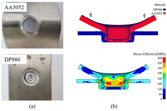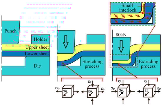 As research on new, lightweight energy vehicles continues to develop, the application of high-strength steel sheets with tensile strength greater than 1 GPa and their mechanical clinching technology, which is associated with aluminum alloys, has emerged as a new research focus. However, due to the challenges associated with the cold deformation of high-strength steel, conventional mechanical clinching processes often fail to establish effective joint interlocking, resulting in weak connections. This study proposes a center-punching mechanical clinching process for connecting DP980 high-strength steel to AL5052 aluminum alloy. The mechanical evolution during the forming process was analyzed via finite element simulation. An orthogonal experimental design was employed to optimize key geometric parameters of the punch and die, yielding the optimal configuration for the mold. Mechanical testing of the joint demonstrated average pull-out force and pull-shear forces of 1124 N and 2179 N, respectively, confirming the proposed process’s ability to successfully connect high-strength steel and aluminum alloy.