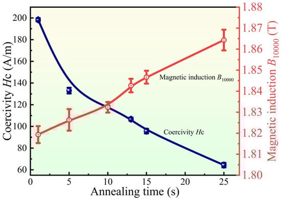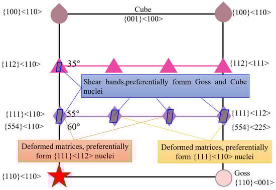 The control of recrystallization in submillimeter-gauge electromagnetic pure iron strips is critical for developing high-sensitivity electromagnetic devices, yet the microstructure–property relationship during annealing remains poorly understood. This study systematically investigates the recrystallization topology, texture evolution, and their direct links to the electromagnetic properties in an industrially produced 0.5 mm thick DT4 electromagnetic pure iron cold-rolled strip (80% reduction) during annealing at 900 °C. By combining EBSD, XRD, and VSM, we found that recrystallization initiates at shear bands after 7 s and completes within 25 s, yielding equiaxed grains with an average size of 27.5 μm. Prolonged annealing to 180 s led to grain coarsening to 64 μm. Concurrently, the fraction of low-angle grain boundaries decreased dramatically from 69.6% to 9.09%. The recrystallization texture, dominated by oriented nucleation at shear bands, showed a stable γ-fiber component (~20% volume fraction) and a significantly attenuated α-fiber component (decreasing from 66.3% to 21.5%). The Goss texture ({110}<001>) increased notably from 0.54% to 14.0%, attributable to grain boundary energy minimization in the later stages. Recrystallization kinetics obeyed the JMAK model Xrex = 1 − exp (−2.29 × 10−8 t6.434). Crucially, the completed recrystallization process reduced the coercivity (Hc) by 78.5% and increased the magnetic induction B10000 by 0.045T. These findings elucidate the recrystallization mechanism and establish a quantitative microstructure–property correlation, providing a theoretical foundation for optimizing industrial annealing processes for thin-gauge electromagnetic pure iron strips.