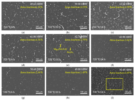This study systematically optimizes the T6 heat treatment of a commercial EV31A magnesium alloy and evaluates the resulting microstructural evolution and mechanical properties. Optical microscopy, scanning electron microscopy combined with energy-dispersive X-ray spectroscopy (SEM-EDS), X-ray diffraction (XRD), and transmission electron microscopy (TEM) were used to characterize the microstructure and phase constitution, while differential scanning calorimetry (DSC) was employed to determine appropriate solution treatment parameters. Brinell hardness measurements and tensile tests at room temperature and 150 °C were carried out to quantify the mechanical response. The as-cast alloy consists of α-Mg equiaxed grains, bone-shaped Mg12(Nd,Gd) eutectic phases at grain boundaries, and minor intragranular lath-shaped Mg12Nd phases. After T6 treatment (520 °C/10 h solution treatment + 200 °C/16 h aging), the grain boundary eutectic phases partially dissolve and transform into Mg41(Nd,Gd)5, while intragranular nano-scale β′ precipitates and stable Zn2Zr3 particles form, achieving multi-scale synergistic strengthening. Compared to the as-cast condition, the T6-treated alloy exhibits room-temperature ultimate tensile strength and yield strength of 309 ± 40.5 MPa (31% increase) and 180 ± 14.2MPa (45% increase), respectively. At 150 °C, the strength reaches 241 ± 7.5 MPa (39% increase) and 154 ± 16.8 MPa (52% increase), while maintaining an elongation of 10.9± 0.7%, demonstrating an excellent strength–ductility balance.
