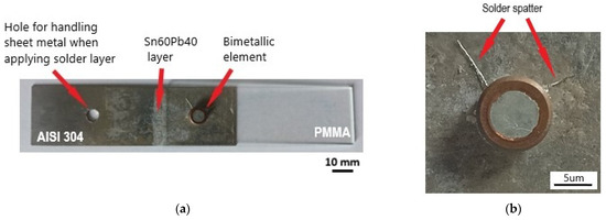 This study investigated the microstructure and properties of soldered joints of AISI 304 stainless steel and PMMA thermoplastic or AW-1050A aluminum alloys made using Resistance Element Soldering (RES) technology. The bimetallic element used in RES provided a mechanical joint with a thermoplastic or