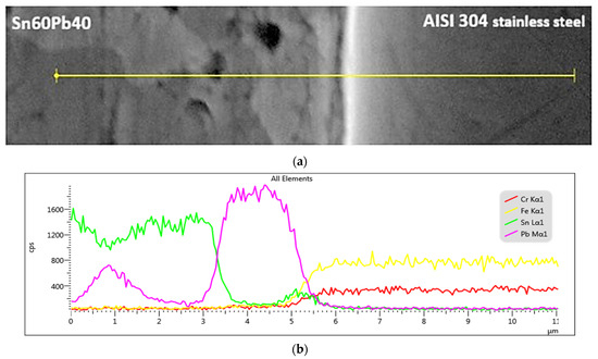 This study investigated the microstructure and properties of soldered joints of AISI 304 stainless steel and PMMA thermoplastic or AW-1050A aluminum alloys made using Resistance Element Soldering (RES) technology. The bimetallic element used in RES provided a mechanical joint with a thermoplastic or aluminum alloy and a soldered joint with AISI 304 steel using Sn60Pb40 solder in the core of the element. The solder in combination with the Chemet CHM-A-014 flux wetted the AISI 304 steel surface very well at a temperature of 225 °C with a contact angle of 14°. During the production of the joints, the solder melted in the bimetallic element on the AISI 304 steel side, while solid solder was retained at the point of contact with the welding electrode. The strength of the joints ranged from 25.5 to 36.4 MPa, which was less than the strength of the solder, and the joints failed at the AISI 304 steel–Sn60Pb40 solder interface. The fracture surface was predominantly formed by the solder. An intermetallic phase of FeSn2 was identified at the interface.