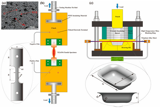 Pulse current-assisted flexible granular medium forming is a promising approach for manufacturing complex thin-walled components from difficult-to-deform Ti2AlNb-based alloys. In this study, the electro-thermo-mechanical deformation behavior of Ti2AlNb sheets is investigated through pulse current-assisted uniaxial tensile tests, microstructural characterization,