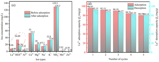 The efficient recovery of rare earth elements (REEs) from low-concentration mine tailwater is crucial for resource sustainability. In this study, a novel composite adsorbent, sesame stalk biochar-supported zirconium phosphate (sBC/ZrP), was synthesized for the selective adsorption and recovery of La3+ as a representative REE. The material was characterized using SEM-EDS, BET, XRD, FTIR, and XPS. Batch adsorption experiments were conducted to evaluate the effects of pH, coexisting ions, and the adsorption kinetics and thermodynamics. The results showed that sBC/ZrP exhibited a high adsorption capacity (up to 185.83 mg/g at 35 °C for 4 h) and strong selectivity for La3+, particularly in the presence of common competing cations, although Al3+ demonstrated significant interference. The adsorption process followed pseudo-second-order kinetics and the Langmuir isotherm model, indicating monolayer chemisorption, and was determined to be spontaneous and endothermic. The material maintained over 90% adsorption efficiency after five consecutive adsorption–desorption cycles. The mechanism primarily involved complexation of La3+ with the P-OH and Zr-O groups on the composite. This work demonstrates that sBC/ZrP is a highly efficient, stable, and reusable adsorbent with significant potential for the recovery of REEs from mining tailwater.
