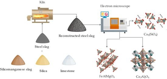 The chemical composition, mineral composition, and mineral distribution characteristics of steel slag were characterized through petrographic analysis, X-ray diffraction (XRD), and particle size analysis. Limestone, silica, and silicomanganese slag were blended with converter steel slag to fabricate a reconstructed steel slag. Through burden