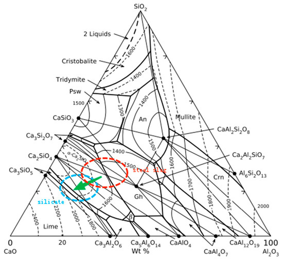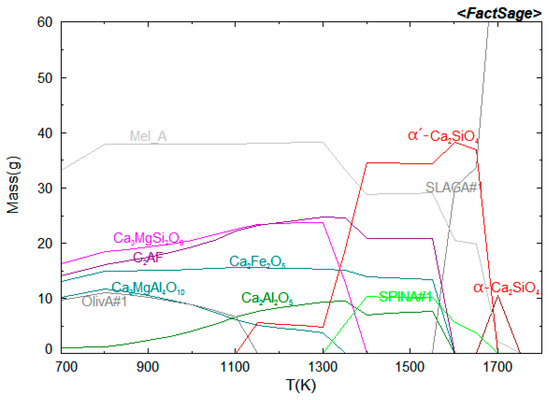 The chemical composition, mineral composition, and mineral distribution characteristics of steel slag were characterized through petrographic analysis, X-ray diffraction (XRD), and particle size analysis. Limestone, silica, and silicomanganese slag were blended with converter steel slag to fabricate a reconstructed steel slag. Through burden calculation, the chemical composition ratio of this reconstructed steel slag approximated the silicate phase region. The high-temperature reconstruction process outside the furnace was simulated through reheating. The composition, structure, and cementitious characteristics of the reconstructed steel slag were investigated through X-ray diffraction (XRD), FactSage software (FactSage version 7.0 (GTT-Technologies, Aachen, Germany, 2015))analysis, scanning electron microscopy–energy dispersive spectroscopy (SEM–EDS) analysis, setting time determination, compressive strength measurement, and thermodynamic computation. The findings indicated that the primary mineral compositions of the reconstructed steel slag were predominantly silicates, such as Ca3Al2O6, Ca2SiO4, Ca2MgSi2O7, Ca2Al(AlSiO7), Ca2(SiO4), and FeAlMgO4. In comparison with the original steel slag, these compositions underwent substantial alterations. The α′-C2S phase appears at 1100 K and gradually transforms into α-C2S at 1650 K. The liquid phase begins to precipitate at approximately 1550 K. Spinel exists in the temperature range from 1300 to 1700 K, and Ca3MgSi2O8 melts into the liquid phase at 1400 K. As the temperature increases to 1600 K, the minerals C2AF, Ca2Fe2O5, and Ca2Al2O5 gradually melt into the liquid phase. Melilite melts into the liquid phase at 1700 K. It was observed that the initial and final setting times of the reconstructed steel slag exhibited reductions of 7 and 43 min, respectively, in comparison to those of the original steel slag. In comparison with steel slag, the compressive strength of the reconstructed steel slag exhibited an increase of 0.6 MPa at the 3-day strength stage, 1.6 MPa at the 7-day strength stage, and 3.4 MPa at the 28-day strength stage. The reduction in setting time and the enhancement in compressive strength verified the improved cementitious activity of the reconstructed steel slag. Thermodynamic calculations of the principal reactions of the reconstructed steel slag at elevated temperatures verified that the primary reaction at 1748 K is thermodynamically favorable.