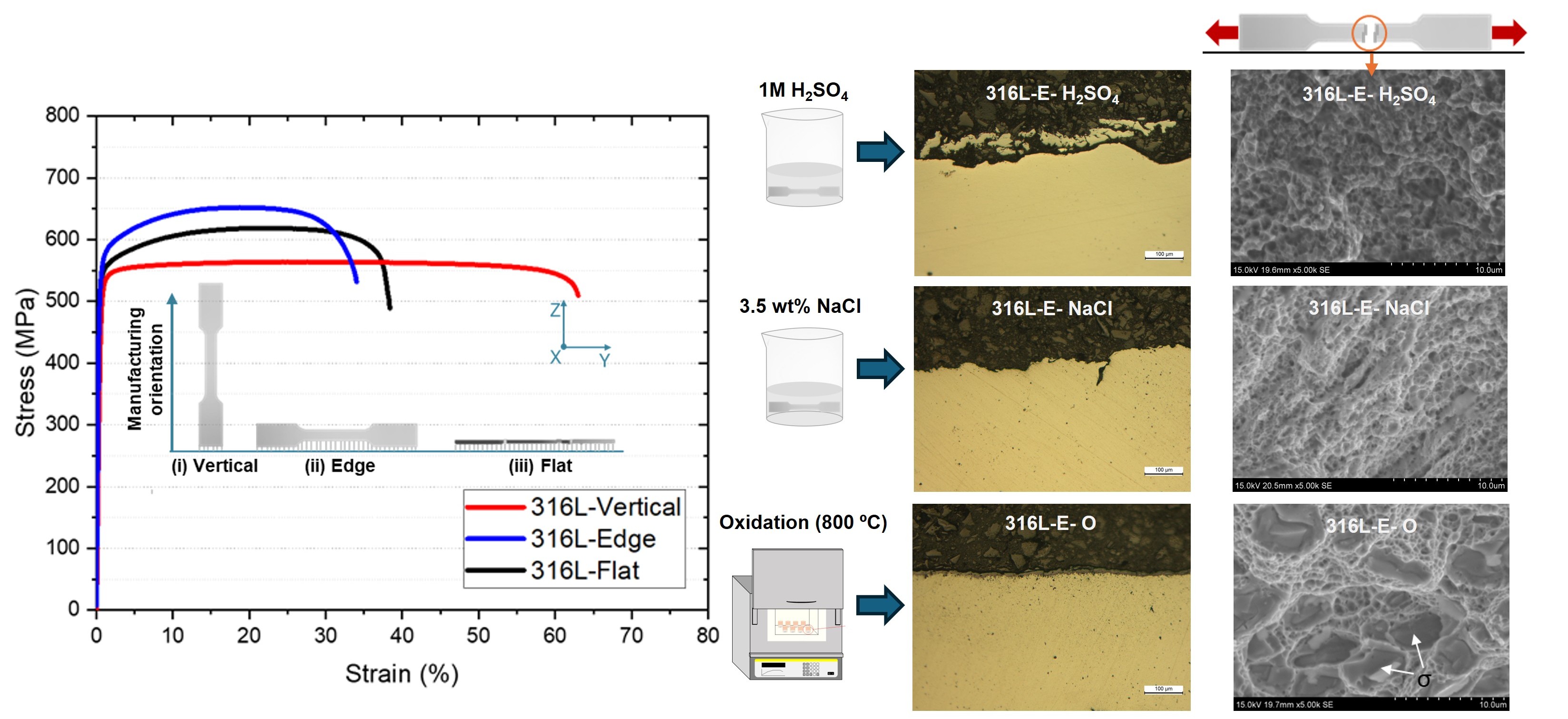 This study addresses the limited understanding of how build orientation and aggressive environments jointly affect the mechanical reliability of L-PBF 316L stainless steel. Specimens were fabricated in vertical, edge, and flat orientations and exposed for 360 h to 1 M H2SO4, 3.5 wt.% NaCl, and dry air oxidation at 800 °C. Tensile tests and microstructural analyses revealed strong anisotropy: edge and flat builds showed higher tensile and yield strength, while vertical builds exhibited greater ductility. Aqueous environments caused surface degradation and moderate strength loss, most severe in vertical samples. High-temperature oxidation induced σ-phase precipitation, increasing tensile strength (~20%) but reducing ductility and yield strength. These findings highlight the critical role of building orientation and service conditions in ensuring long-term performance of L-PBF 316L stainless steel.