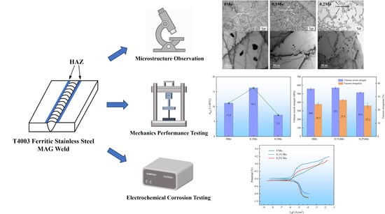 In the present contribution, Hot-rolled and annealed ferritic stainless steel T4003 with three distinct Mo contents (0%, 0.1%, and 0.2%) served as the research subject. Weldability tests were implemented by means of gas metal arc welding. Coupled with microstructural characterization, mechanical property assessments,