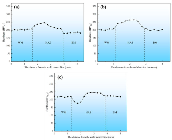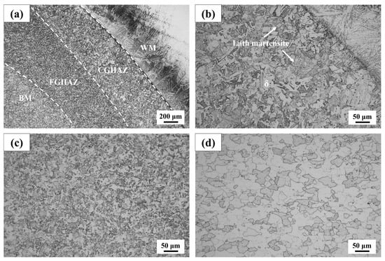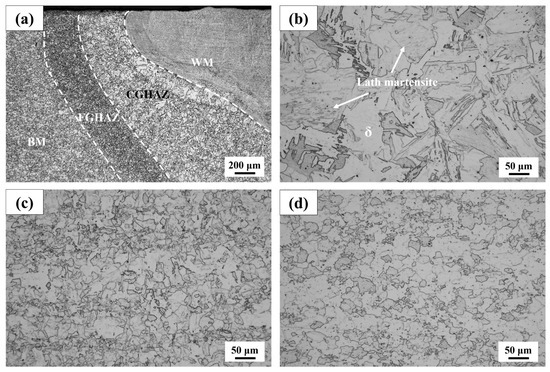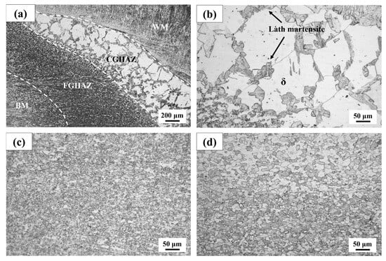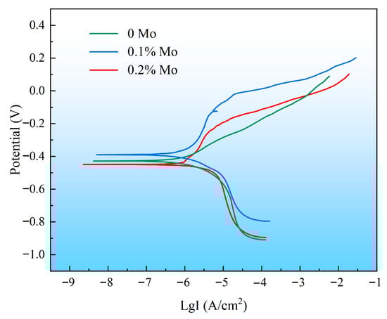 In the present contribution, Hot-rolled and annealed ferritic stainless steel T4003 with three distinct Mo contents (0%, 0.1%, and 0.2%) served as the research subject. Weldability tests were implemented by means of gas metal arc welding. Coupled with microstructural characterization, mechanical property assessments, and electrochemical corrosion tests, the regulatory mechanism of Mo on the microstructure and properties of the HAZ was systematically elucidated. Results demonstrate that the influence of Mo content on the evolution of the coarse-grained region structure of heat affected zone becomes significant. The addition of 0.1% Mo refines the grains, increasing the fraction of lath martensite to 70–75% while limiting the maximum width of the coarse-grained zone to 0.64 mm. Meantime, the addition promotes the precipitation of (Nb, Ti, Mo) (C, N) composite carbonitrides, enhancing overall performance through synergistic grain refinement and second-phase strengthening. The sample with 0.1% Mo exhibits an average low-temperature impact energy of 16.3 J at −40 °C, with the highest Vickers hardness in the HAZ, favorable strength–plasticity synergy of the welded joint, and optimal corrosion resistance. The coarse-grained zone of the 0.2% Mo sample is dominated by coarse δ-ferrite and features a larger width, and the HAZ shows inferior mechanical properties and corrosion resistance. The precipitated phases in the 0.2% Mo segregate along the grain boundaries and distribute in a chain-like distribution, exacerbating the deterioration of material properties. These findings provide a technical reference for optimizing the composition design of T4003 ferritic stainless steel and ensuring its safe application in railway freight vehicles.