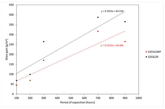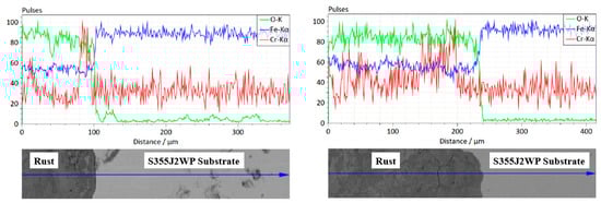 The design of ladle furnace (LF) refining pathways for weathering steels requires precise control of multi-component steel/slag reactions governed simultaneously by thermodynamics and interfacial mass transfer kinetics. An EERZ-based kinetic modeling strategy was employed using the Thermo-Calc® (version 2022a) Process Metallurgy Module and the CALPHAD TCOX11 database to develop LF refining schedules capable of upgrading conventional S355J2R steel to weathering steel grades: S355J2W and S355J2WP. First, the sensitivity of predicted compositions to key kinetic inputs was quantified. The validated model was then used to simulate deoxidation and desulfurization sequences, predicting the evolution of liquid–steel and slag compositions, slag basicity, and FeO activity throughout the LF cycle. Subsequently, Cr- and P-ferroalloys were introduced to design tap-to-tap schedules that meet the EN 10025-5 chemical specifications for S355J2W and S355J2WP. To correlate simulation outcomes with material performance, plates produced following the modeled schedules were evaluated through a 1000 h accelerated salt spray test. Steel density and steel phase mass transfer coefficients were found to produce the highest prediction sensitivity (up to 7.5 wt.% variation in C and S), whereas slag phase parameters exhibited a lower impact. The predicted steel compositions showed strong agreement with industrial values obtained during plant trials. SEM-EDS analyses confirmed the development of a Cr-enriched protective patina and validated model-based alloying strategies.