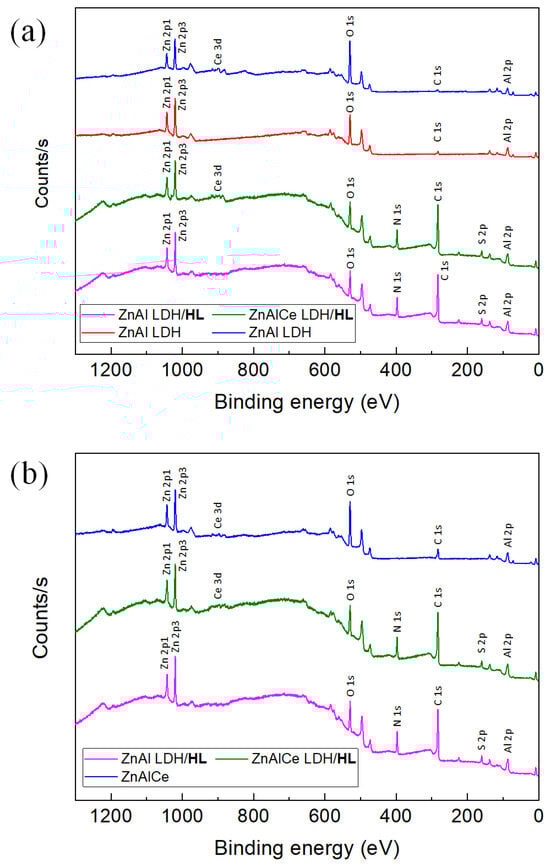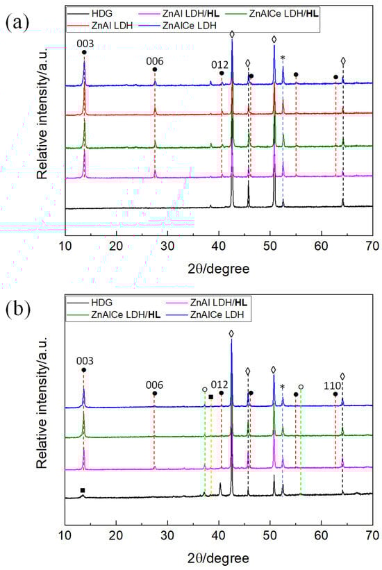 ZnAl and ZnAlCe layered double hydroxide (LDH) conversion layers modified with picolinoyl N4-phenylthiosemicarbazide (HL) are fabricated on hot-dip galvanized steel (HDG) to improve corrosion protection. X-ray diffraction (XRD) confirms that HL molecules are not intercalated within the LDH interlayers, whereas Fourier transform infrared spectroscopy (FT-IR), X-ray photoelectron spectroscopy (XPS), and energy-dispersive X-ray spectroscopy (EDS) analyses reveal their surface adsorption. Moreover, scanning electron microscopy (FE-SEM) observations reveal that HL modification induces changes in surface morphology. After 168 h in 0.1 M NaCl, the LDH structure remains intact, and N and S signals are still detected, confirming the persistence of both the LDH layer and adsorbed HL molecules under corrosive conditions. During 168 h immersion in NaCl, electrochemical measurements indicate that the modified LDH layers exhibit higher corrosion resistance than the unmodified ones, with the ZnAlCe LDH/HL coating providing the most effective protection.