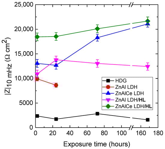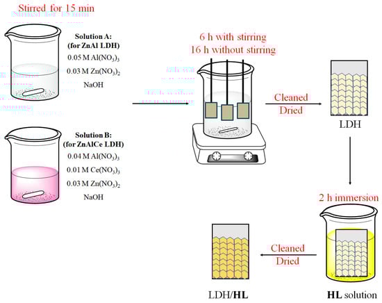 ZnAl and ZnAlCe layered double hydroxide (LDH) conversion layers modified with picolinoyl N4-phenylthiosemicarbazide (HL) are fabricated on hot-dip galvanized steel (HDG) to improve corrosion protection. X-ray diffraction (XRD) confirms that HL molecules are not intercalated within the LDH interlayers, whereas Fourier