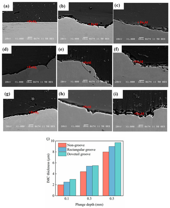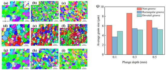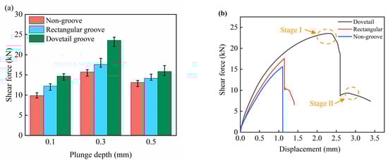 The self-riveting friction stir lap welding (SRFSLW) method was utilized to improve the bonding strength of lap welding joints with medium-thick aluminum/steel plates and to realize structural lightweighting. The effect of plunge depth on the shear force and the microstructure of the joint was studied, and the influence of groove structure (rectangular groove and dovetail groove) on the failure behavior of the joint under shear load was obtained, simultaneously. The EBSD results indicate that the aluminum alloy grains in the stir zone (SZ) of groove joints have been refined compared to the non-groove joint. Meanwhile, due to the presence of grooves, the proportion of high-angle grain boundaries of the SZ is increased, and more dynamic recrystallization has emerged; thus, the KAM value of the SZ is reduced to a certain extent. The non-groove joint exhibits {111}//ND fiber texture, while the groove joint shows F-plate texture. In self-riveting joints, due to the increased metallurgical bonding area and the weakened effect of external loads, the failure of metallurgical bonding in the joint requires higher external load, and the separation of the self-riveted structure from the groove requires greater bending moment, thereby improving the strength of the joint.