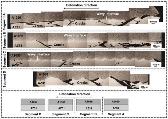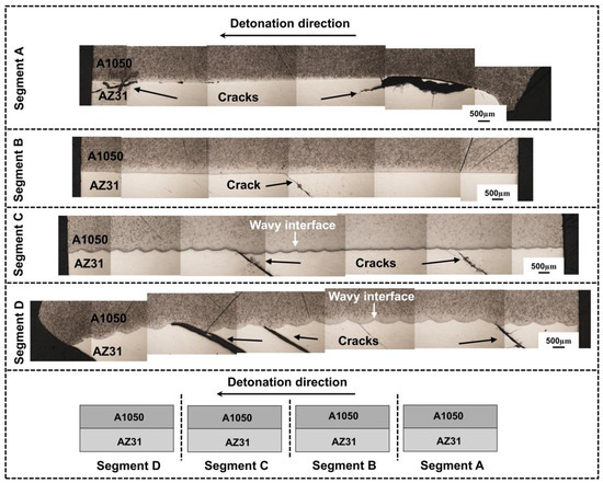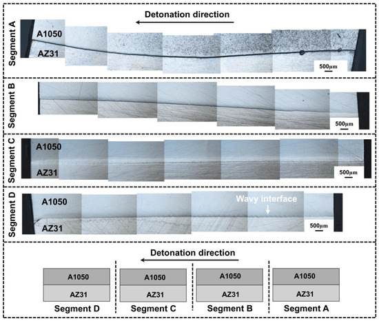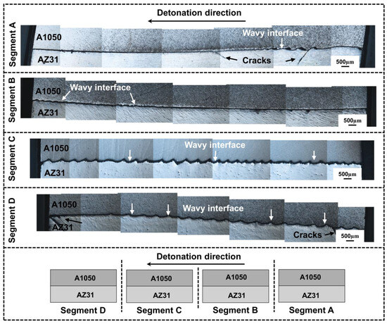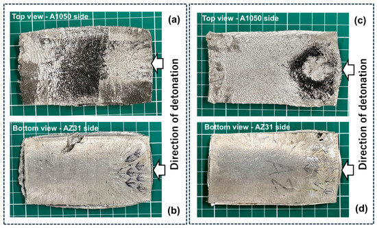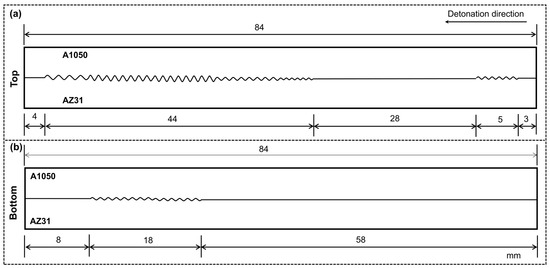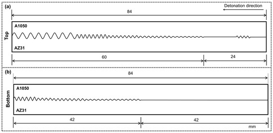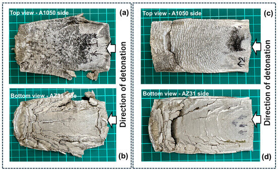 The present study systematically investigates, for the first time, the combined influences of detonator position (top-edge and bottom-edge initiations) and anvil material (steel and sand) on the interfacial microstructure and mechanical performance of explosively welded A1050/AZ31 dissimilar joints. When welding was conducted using