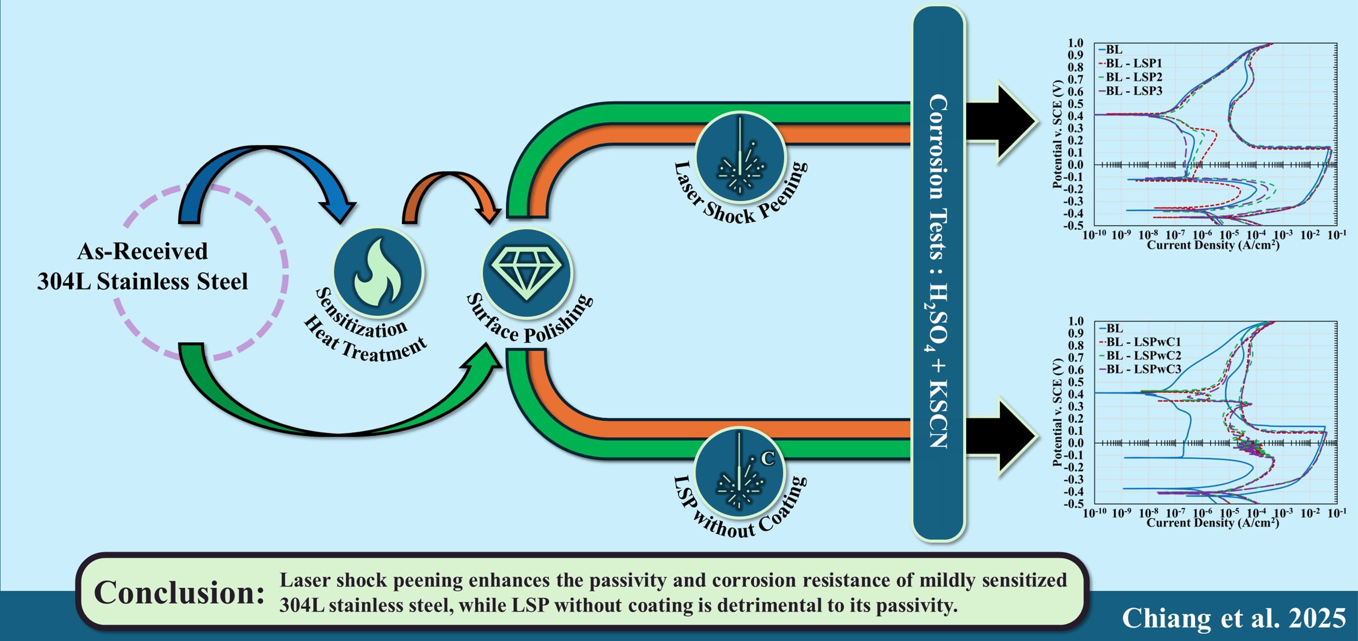 This study examined the effects of laser shock peening (LSP) and LSP without protective coating (LSPwC) on the microstructure and corrosion behavior of 304L stainless steel using cyclic polarization testing. LSP enhanced corrosion resistance under mild sensitization (650 °C; 5 h) by inducing compressive stress and increasing dislocation density, stabilizing the passive film. Limited improvement was observed under severe sensitization (650 °C; 24 h). Deformation-induced martensite detected by XRD was attributed to mechanical polishing, not LSP. In contrast, LSPwC reduced corrosion resistance across all conditions due to Fe-rich surface oxides that impaired passivation.