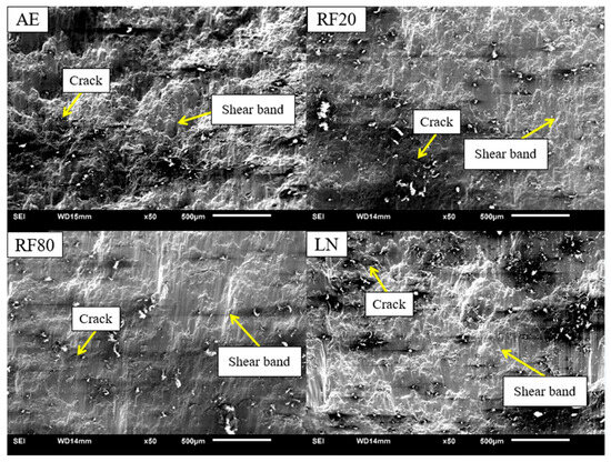 To address surface defects and enhance the wear resistance of 316L stainless steel parts fabricated by Selective Laser Melting (SLM), this study applied shot peening (SP) surface treatment to the SLM-processed samples. Ball-on-disk tribological tests were systematically conducted under water-lubricated conditions to investigate the evolution of surface morphology, microstructure, microhardness, and tribological performance before and after SP. The results indicate that SP induced severe plastic deformation in the surface layer, effectively refining the coarse columnar crystals and melt pool structures characteristic of SLM, and forming a crystalline hardened layer with a depth of 70–80 μm. Consequently, the surface microhardness increased by 21.97% compared to the un-peened samples. Under loads of 20 N and 30 N, the coefficient of friction (COF) of the SP-treated samples decreased by 16.36% and 12.4%, while the wear rate was reduced by 17.09% and 14.9%, respectively. In this load range, the samples primarily exhibited uniform plowing and localized adhesive wear, demonstrating significantly improved resistance to plastic deformation and crack initiation. However, when the load increased to 40 N, intense stress and thermal effects diminished the strengthening benefits of SP, resulting in no significant difference in tribological performance between the SP-treated and untreated samples. At this stage, the dominant wear mechanism transitioned to severe plastic deformation, extensive delamination, and thermally induced adhesion.