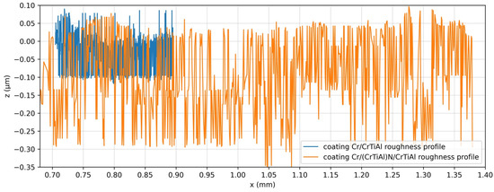 Test specimens fabricated from 42CrMo4 steel were subjected to heat treatment comprising quenching followed by high-temperature tempering. This treatment is commonly referred to as hardening, and the result is a tempered sorbite microstructure that provides a balanced combination of strength and plasticity. In order to improve the hardness and wear resistance of the contact surfaces, two types of physical vapor deposition (PVD) coatings were deposited onto the specimens: the first was a two-component architecture Cr/CrTiAl and the second was a multilayer Cr/(CrTiAl)N/CrTiAl. In both configurations, an intermediate chromium adhesion layer was initially deposited to enhance interfacial bonding with the substrate. The adhesion strength of the deposited coatings to the steel substrates was evaluated using a standardized adhesion test. The adhesion quality was classified as HF1 (the highest adhesion class in the HF1–HF6 scale, defined in EN ISO 26443), indicating excellent interfacial bonding. The hardness and modulus of elasticity of both coatings were determined through nanoindentation. According to the measured hardness values of the two coatings, 27.3 GPa (Cr/CrTiAl) and 37.5 GPa (Cr/(CrTiAl)N/CrTiAl), they can be classified as hard coatings (hardness greater than 20 GPa). Despite the difference in hardness, the two coatings have comparable elastic modulus values: Eit = 353 GPa for the two-component architecture coating and Eit = 349 GPa for the three-component architecture coating. Tribological characterization was performed using the ball-on-disc method under dry sliding conditions over a total sliding distance of 59 m, whereby the friction coefficient (µ) was recorded. Additionally, the wear rate of the applied coatings was calculated from the measured wear volumes or profiles. The two coatings have comparable friction coefficient values (Cr/CrTiAl–μ = 0.362, Cr/(CrTiAl)N/CrTiAl–μ = 0.325), but the three-component architecture coating Cr/(CrTiAl)N/CrTiAl has a lower wear rate (k = 1.64 × 10−4) compared to the two-component architecture coating Cr/CrTiAl, which has a wear rate of k = 7.6 × 10−4. The investigated coatings have hardness, modulus of elasticity and friction coefficient values competitive with those of nitride coatings (two-component architecture and three-component architecture), and their wear rate also corresponds to generally accepted values.