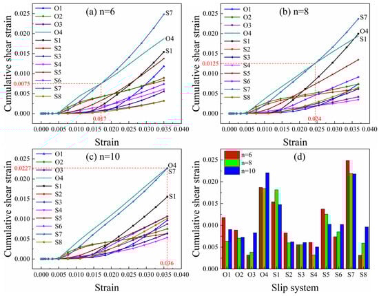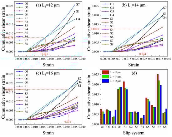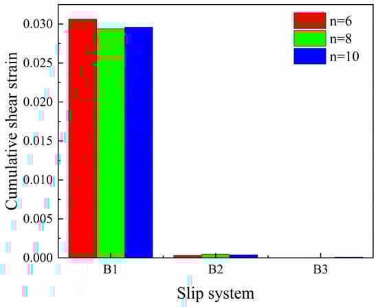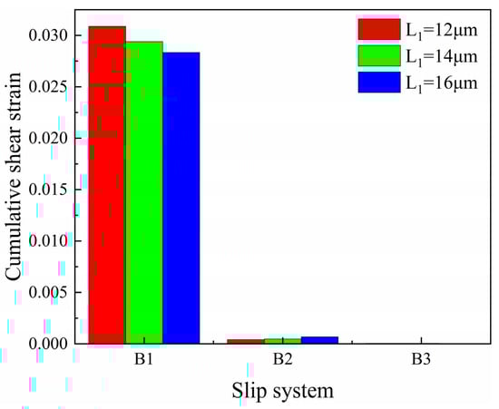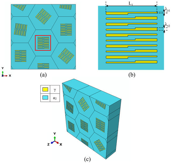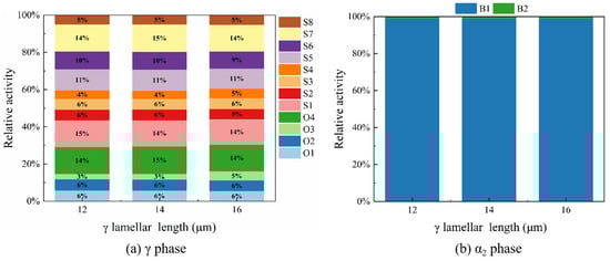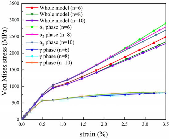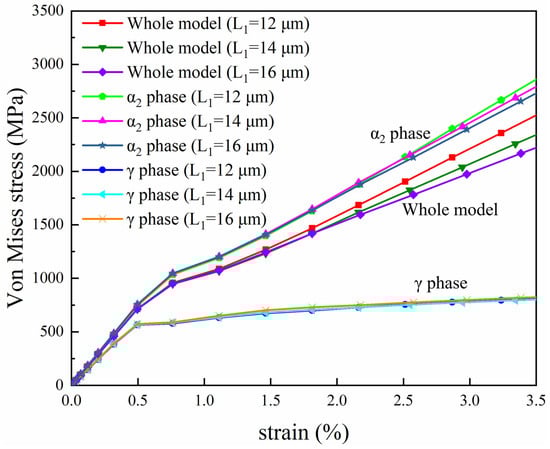 The preparation of the core–shell-like structured before hot working can significantly enhance the hot workability of the alloy. In order to research the properties of the alloy, the finite element method combined with the crystal plasticity constitutive theory was used to establish the finite element model of the core–shell-like structured TiAl alloy with (α2 + γ) lamellae colonies as the core and α2 matrix as the shell. The research focuses on the influence of the length and number of γ lamellae on the stress–strain distribution and the contribution of slip systems in each phase to the plasticity of the alloy. The results show that when the γ lamella length increases from 12 μm to 16 μm, the overall stress decreases by 12.0%; when the number increases from 6 to 10, the stress decreases by 7.7%. The stress reduction is primarily influenced by the α2 phase. Increasing the volume fraction of γ lamellae facilitates stress distribution within the α2 phase and enhances the plasticity of the material. In the γ phase O4, S1 and S7 slip systems contribute the most to the plastic deformation of the γ phase. In the α2 phase, the B1 slip system is the main contributor to the plasticity of the α2 phase. And the B1 slip system contributes more significantly to the plastic deformation of the entire model.