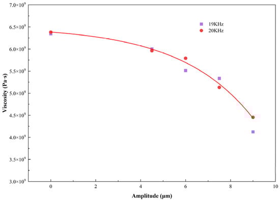 The processing of bulk amorphous alloys is typically realized through superplastic deformation in the supercooled liquid region, and current research efforts predominantly focus on enhancing formability by optimizing processing parameters such as temperature and duration. However, excessive temperatures or prolonged exposure times can induce crystallization, which severely compromises the mechanical and functional properties of the alloy. This study presents the design of an ultrasonic vibration (UV)-assisted metal hot-forming apparatus that integrates an ultrasonic vibration field into the superplastic flow deformation of amorphous alloys. High-temperature compression experiments were conducted on Zr55Cu30Al10Ni5 amorphous alloy, and finite element simulations were performed to model the experimental process. Results show that ultrasonic vibration reduces the flow stress of the amorphous alloy, thereby enhancing its superplastic deformation capability. Simulation analysis reveals that surface effects arise from periodic interface separation between the pressure plate and the specimen caused by ultrasonic vibration, leading to a cyclic disappearance of friction forces, which manifest macroscopically as a reduction in effective friction. On the other hand, vibration introduces additional strain rates. Since the undercooled liquid of amorphous alloys exhibits non-Newtonian fluid behavior characterized by shear-thinning, ultrasonic vibration assistance can effectively reduce the apparent viscosity, thereby improving their filling capacity.
