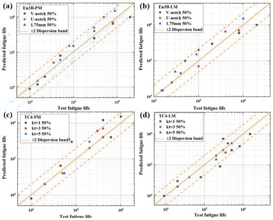Notch and size effects significantly influence the fatigue performance of engineering components, which is crucial for ensuring structural integrity. A novel probabilistic fatigue life prediction Kt-V-L model considering both the size and the notch effect, based on the theory of critical distance L (TCD) and the improved highly stressed volume V (HSV) method, is proposed in this study. The new definition more accurately characterizes fatigue damage and accumulation, overcoming the underestimation issues of traditional HSV methods under high-stress or low cycle fatigue (LCF) conditions. Specifically, the Weibull distribution is also proposed to characterize the material fatigue failure probability. The experimental data of 26Cr2Ni4MoV, En3B, and TC4 materials with varying notched sizes are utilized for the model validation and comparison. In addition, the predictive ability of the point method (Kt-V-L-PM) and line method (Kt-V-L-LM) under the novel proposed model was explored and evaluated. The predicted lives of 26Cr2Ni4MoV specimens fall within the ±2 scatter band of the Kt-V-L-LM, while the Kt-V-L-PM shows increasing deviation with larger notches due to its limited ability to capture stress gradients. For En3B and TC4, the predicted lives are within ± 2 life factors, verifying the model’s reliability and accuracy. Furthermore, fracture morphology analysis reveals the influence of notches on fatigue performance and elucidates the fracture failure mechanisms.
