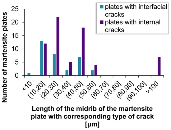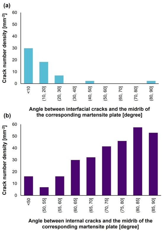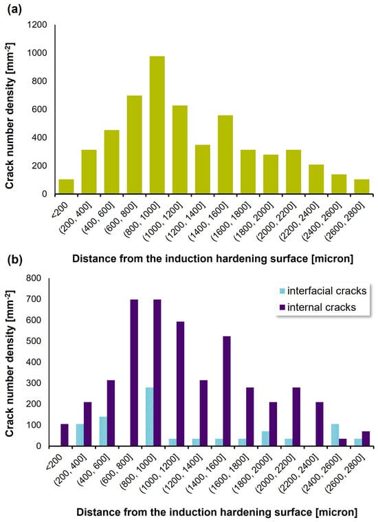 High-performance induction-hardened bearing steels are prone to quench cracking during manufacturing, causing significant material and energy waste. Understanding the physics behind microcracking is essential to the design of alloys and processes with reduced cracking behaviour. However, conventional quench crack analysis methods provide information only on crack severity and neither link martensite microstructure to microcrack formation or provide meaningful insights on the origins of microcracking. Therefore, this work introduces a new crack quantification method that assesses various crack features, including crack length, location within a martensite plate, crack angle to the plate midrib, and the distance from the induction-hardened surface. It is found that microcrack severity changes with the distance from the induction-hardened surface, peaking at ∼1 mm in depth, with a maximum density of approximately 1000 cracks per mm2. In addition, microcracks are mostly seen in the martensite plates rather than at the austenite–martensite interface, with the majority lying perpendicular to the midrib. Approximately 50% of the interfacial cracks are oriented at an angle less than 10 °C to the martensite midrib and are mainly located around the midpoint of the interface. Martensite plates having interfacial cracks are mostly 10–20 μm long, whereas martensite plates with internal cracks are mostly 20–30 μm long. The new method helps build quantitative links between microcracking and martensite morphology to study the mechanisms of cracking and the role of the initial microstructure in more detail.