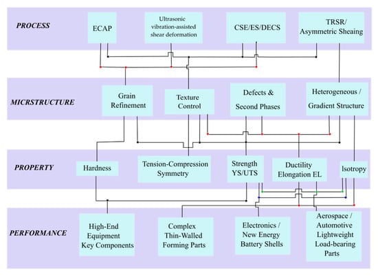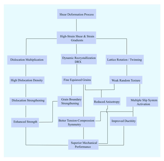 Magnesium (Mg) alloys are the lightest metals used in engineering structures, making them highly valuable for lightweight designs in aerospace, automotives, and related industries. Their low density offers clear advantages for reducing product weight and improving energy efficiency–key priorities in modern manufacturing. However, their unique crystal structure leads to notable drawbacks: low plasticity at room temperature, uneven performance across different directions, and inconsistent strength under tension versus compression. These issues have severely limited their broader application beyond specialized use cases. Shear deformation methods address this challenge by creating high strain variations and complex stress conditions. This approach provides an effective way to regulate the internal structure of Mg alloys and enhance their overall performance, overcoming the inherent limitations of their crystal structure. This paper systematically summarizes current research on using shear deformation to process Mg alloys. It focuses on analyzing key structural changes induced by shear, including the formation and evolution of shear–related features, real–time grain reorganization, crystal twinning processes, the distribution of additional material phases, and reduced directional performance bias. The review also clarifies how these structural changes improve critical mechanical traits: strength, plasticity, formability, and the balance between tensile and compressive strength. Additionally, the paper introduces advanced shear–based processes and their derivative technologies, such as equal–channel angular extrusion, continuous shear extrusion, and ultrasonic vibration–assisted shearing. It also discusses strategies for constructing materials with gradient or mixed internal structures, which further expand the performance potential of Mg alloys. Finally, the review outlines future development directions to advance this field: developing shear processes that combine multiple physical fields, conducting real–time studies of microscale mechanisms, designing tailored shear paths for high–performance Mg alloys, and evaluating long–term service performance. These efforts aim to promote both theoretical innovation and industrial application of shear deformation technology for Mg alloys.