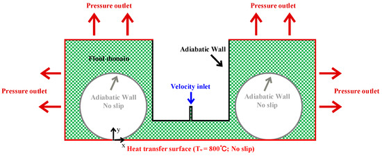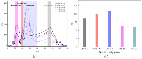 The quenching deformation of ultra-high-strength steel sheets is a technical challenge in the steel industry. Although air-jet quenching can effectively improve shape quality, it requires substantial energy consumption. How to improve the heat transfer intensity of air jets by improving key components has become the keypoint of using this technology in industry. In this study, a CFD model was established to investigate the impacts of nozzle shapes and jet arrangements on the flow structure, wall heat transfer intensity and wall heat transfer uniformity under the same total flow rate. The results show that the impingement heat transfer could only be realized by adopting a symmetrical nozzle design (including the symmetric nozzle shape and jet arrangement). And the intensity and uniformity of wall heat transfer were hardly affected by the specific symmetrical nozzle shape. Moreover, under the S/B (ratio of slot spacing to slot width) condition adopted in this study, multiple jets did not significantly enhance heat transfer uniformity but instead tended to reduce the overall heat transfer intensity. In this paper, the configuration of the horizontal nozzle with the central single jet was optimal due to its high heat transfer intensity, good heat transfer uniformity and lower energy consumption.