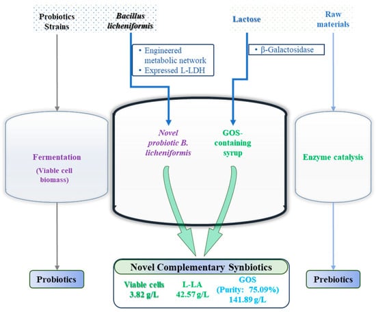 Using Bacillus licheniformis H107 as the initial strain, a novel complementary synbiotics production method was developed through comprehensive metabolic engineering strategies. Key modifications included the systematic analysis and reconstruction of the central carbon metabolism pathway through precise gene editing, targeting the deletion of pflB, alsS, ydaP, and pycA genes while disrupting ganA1 and ganA2 to block galactooligosaccharide (GOS) metabolism. Additionally, heterologous expression of the L-lactate dehydrogenase gene (BcoaLDH) was implemented, resulting in the engineered strain H107-06A. Shake-flask fermentation under anaerobic conditions with 20 g/L glucose yielded L-lactic acid production of 4.45 g/L, representing a 15.3-fold increase compared to the wild type. In a 5 L fermenter using GOS syrup as the carbon source, the engineered system synergistically produced complementary synbiotics, comprising L-lactic acid (42.56 g/L), GOS (141.89 g/L, accounting for 75.09% of total sugars), and viable cells (3.82 g/L). These findings provide a foundation for developing innovative and functional fermentation products.