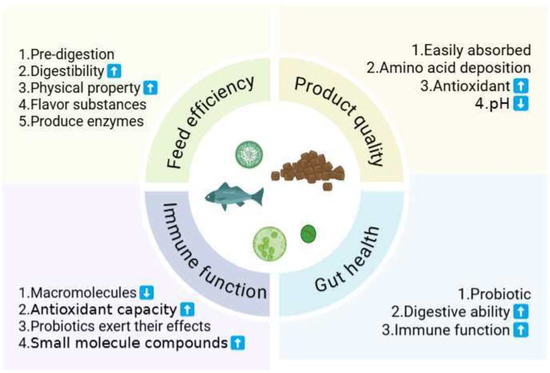 Probiotics include various bacterial species, bacteriophages, microalgae, and yeasts, and can be used in terrestrial animals and aquaculture. Commercially available feed additives may contain mono or multi-strains and work through bactericidal and bacteriostatic mechanisms. Bactericidal action is responsible for the direct inactivation of pathogens in the gut with the help of bacteriocins, hydrogen peroxide, and organic acids, while competition for nutrients, adhesion sites, and changes in environmental conditions may lead to a bacteriostatic effect.