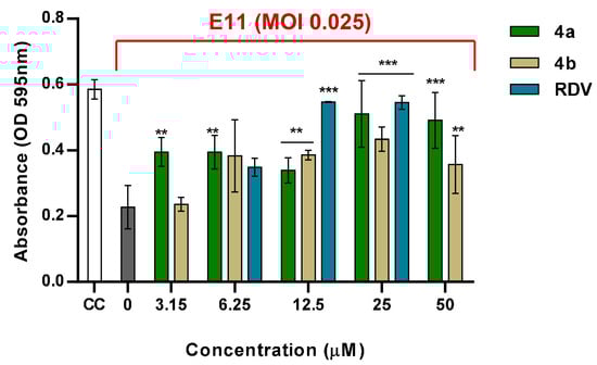 From July 2022, a novel Echovirus 11 (E11) variant has been associated with severe neonatal infections and liver failure. Currently, there are no vaccines or antiviral options for the targeted treatment of non-polio enterovirus (EV) infections; therefore, anti-EV drugs are urgently needed. In this study, the putative anti-E11 activity of two isoxzoline-carbocyclic monophosphate nucleotides (4a and 4b) was evaluated in vitro by cytopathic effect (CPE) reduction in VERO 76 cells and qRT-PCR. Treatment with nucleotide 4a at 25 and 50 μM successfully diminished the CPE caused by E11 by 90% and 75%, respectively, and induced a reduction in viral RNA in the supernatant by 72% and 89%. In contrast, the treatment with 25 and 50 μM of 4b caused a minor inhibition of CPE (58 and 38%), and no significant E11 RNA level changes were observed. A time course viral progeny production assay was performed to assess the inhibitory effect of nucleotide 4a on E11 infection progression. Compared to the control, the treated group showed a significant drop in viral RNA levels, with reductions of 43% at 10 h, 65% at 24 h, and 96% at 48 h post-infection. The results showed the extensive antiviral properties of the monophosphate nucleotide 4a in vitro. Moreover, a retrospective molecular docking study strongly supports that nucleotide 4a is an RdRp inhibitor capable of decreasing E11 genome replication and virus particle formation in VERO 76 cells.