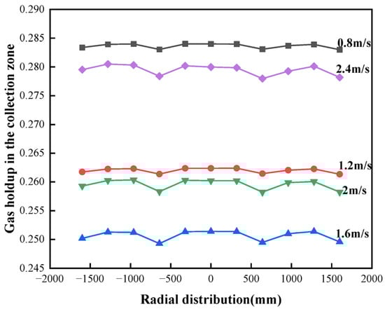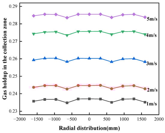 This study aims to clarify the influence mechanism of air–water–mineral three-phase flow behavior on separation efficiency in a graphite flotation column, addressing the issues of over-breaking of coarse graphite flakes and low recovery of fine particles caused by mismatched flow fields and operating parameters in traditional flotation columns. Using CFD numerical simulations based on the Eulerian multiphase flow model, the standard k-ε turbulence model, and scalable wall functions, the effects of feed velocity (0.8–2.4 m/s) and aeration velocity (1–5 m/s) on the flow field structure, gas holdup distribution, and weighted average bubble–particle collision probability inside the column were systematically analyzed. Key quantitative results show that under the synergistic condition of a feed velocity of 2 m/s and an aeration velocity of 3 m/s, an internal circulation flow field conducive to particle retention is formed. Under these conditions, the gas holdup in the collection zone reaches an optimal range (0.26–0.27), and the weighted average collision probability increases by approximately 22% compared to the baseline condition. Aeration velocity shows a significant positive correlation with gas holdup in the collection zone (~0.235 at 1 m/s, rising to ~0.285 at 5 m/s). While an increase in feed velocity reduces the overall gas volume fraction, it enhances turbulence and promotes uniform bubble dispersion through the spatial distribution of regions with high collision probability from the upper part to the upper–middle part of the column and improves the uniformity of distribution. The novelty of this study lies in being the first to quantitatively reveal, through CFD simulation, the coupled regulatory effects of feed velocity and aeration velocity on the stratified flow field structure and mineralization probability in a flotation column and to identify the key optimization threshold of “2 m/s feed velocity”. The practical significance is that it provides a clear theoretical basis and operational window for energy saving, consumption reduction, and process intensification in industrial flotation columns. It offers directly applicable parameter optimization strategies for the efficient recovery of fine-flake graphite and the protection of coarse flakes.