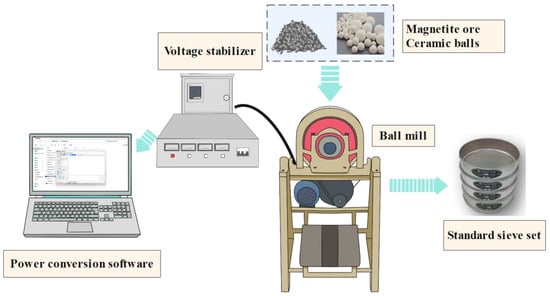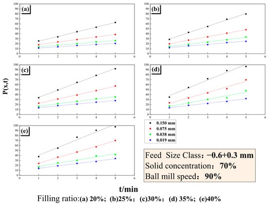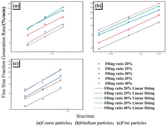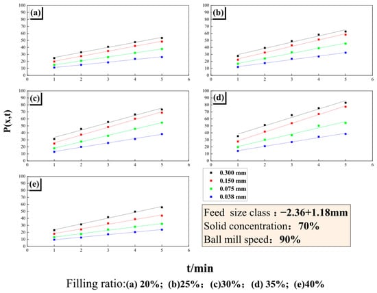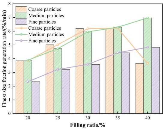 To clarify the influence of the media filling ratio on fine particle production during ceramic ball grinding of magnetite, magnetite ore from the fine grinding stage of an industrial concentrator was investigated under different feed size classes and media filling ratios through grinding kinetics experiments. The generation behavior of the fine and finest particle fractions during ceramic ball grinding was systematically analyzed. The results indicate that particle size fractions with sizes less than or equal to 0.150 mm exhibit pronounced zero-order production characteristics under different filling ratios, with cumulative yields showing a strong linear relationship with grinding time. This zero-order behavior is insensitive to variations in the media filling ratio. Conversely, the generation rate of the finest size fraction is significantly affected by the media filling ratio. For coarse feed sizes, the generation rate of the finest fraction initially increases and then decreases with increasing filling ratio, reaching a peak value of 6.23%/min at a filling ratio of 35%. When the feed falls below 1.18 mm, the generation rate of the finest fraction shows a strong positive correlation with the ceramic ball filling ratio. Furthermore, based on the functional relationship between the generation rate of the finest size fraction and the mill input power, an energy–size model for magnetite ceramic ball grinding was established, providing a quantitative description of the variation in the finest particle yield with respect to the input energy and media filling ratio. The findings provide a theoretical foundation for optimizing media filling ratios, enhancing fine grinding performance, and controlling overgrinding in industrial applications.