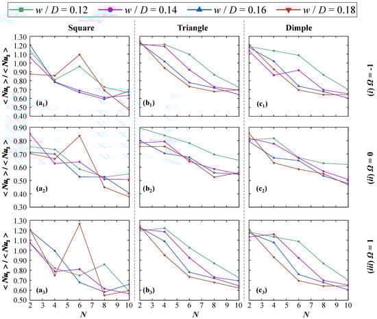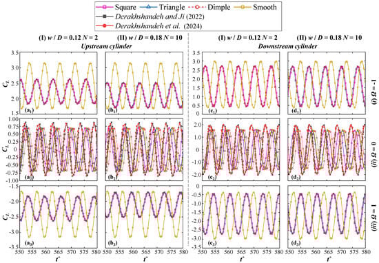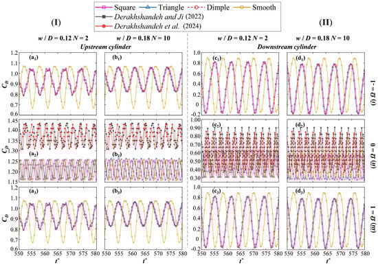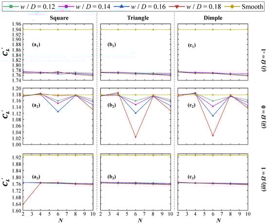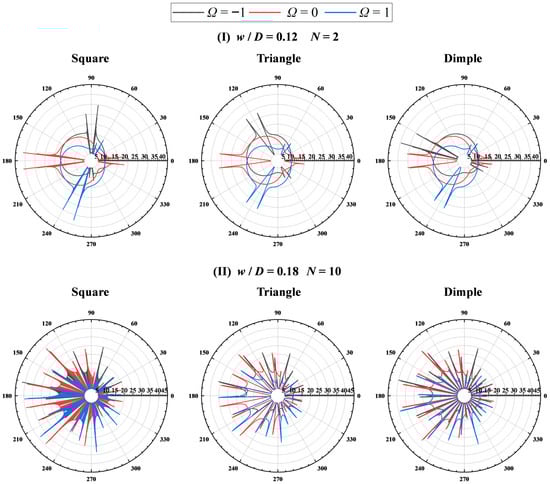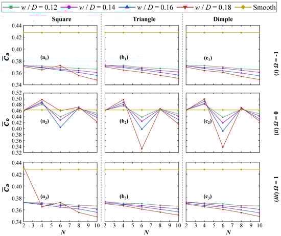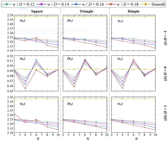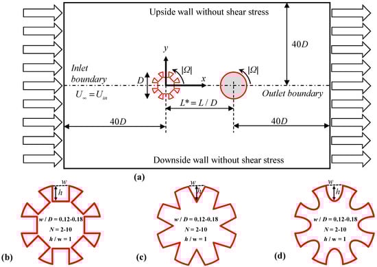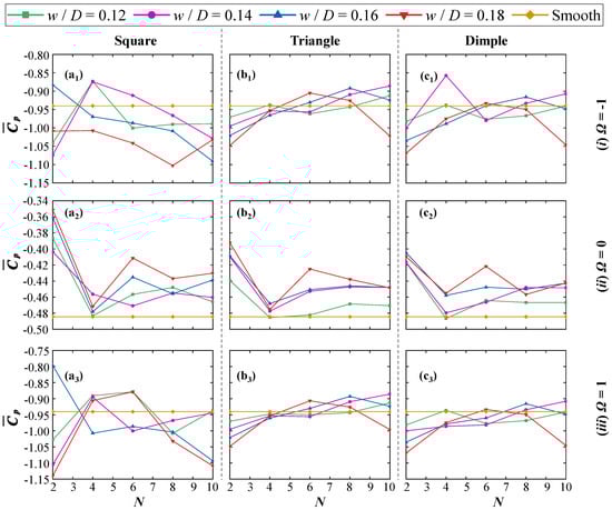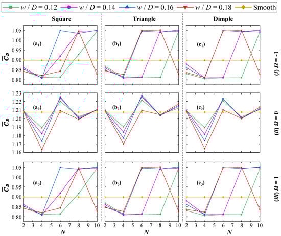 Tandem cylinders, widely used in heat exchangers, water storage units, and electronic cooling, require optimized flow and heat transfer to enhance engineering performance. However, the combined effects of various factors in tandem configurations remain insufficiently explored. This study proposes an innovative approach that integrates multiple parameters to systematically investigate the influence of surface pattern characteristics and rotational speed on the fluid dynamics and heat transfer performance of tandem cylinders. Numerical simulations are conducted to evaluate the effects of various pattern dimensions (w/D = 0.12–0.18), surface shapes (square, triangular, and dimpled grooves), rotational speeds (|Ω| ≤ 1), and frequencies (N = 2–10) on fluid flow and heat transfer efficiency at Re = 200. The study aims to establish the relationship between the complexity of the coupling effects of the considered parameters and the heat transfer behavior as well as fluid dynamic variations. The results demonstrate that, under stationary conditions, triangular grooves exhibit larger vortex structures compared to square grooves. When a positive rotation is applied, coupled with increases in w/D and N, square grooves develop a separation vortex at the front. Furthermore, the square and dimpled grooves exhibit significant phase control capabilities in the time evolution of lift and drag forces. Under conditions of w/D = 0.12 and w/D = 0.18, the CL of the upstream cylinder decreases by 17.2% and 20.8%, respectively, compared to the standard smooth cylinder. Moreover, the drag coefficient CD of the downstream cylinder is reduced to half of the initial value of the upstream cylinder. As the surface amplitude increases, the CD of the smooth cylinder surpasses that of the other groove types, with an approximate increase of 8.8%. Notably, at Ω = −1, the downstream square-grooved cylinder’s CL is approximately 12.9% lower than that of other groove types, with an additional 6.86% reduction in amplitude during counterclockwise rotation. When N increases to 10, the of the upstream square-grooved cylinder at w/D = 0.18 decreases sharply by 20.9%. Conversely, the upstream dimpled-groove cylinder significantly enhances at w/D = 0.14 and N = 4. However, the upstream triangular-groove cylinder achieves optimal stability at w/D ≥ 0.16. Moreover, at w/D = 0.18 and N = 6, square grooves show the most significant enhancement in vortex mixing, with an increase of approximately 42.7%. Simultaneously, the local recirculation zones in dimpled grooves at w/D = 0.14 and N = 6 induce complex and geometry-dependent heat transfer behaviors. Under rotational conditions, triangular and dimpled grooves exhibit superior heat transfer performance at N = 6 and w/D = 0.18, with TPI values exceeding those of square grooves by 33.8% and 28.4%, respectively. A potential underlying mechanism is revealed, where groove geometry enhances vortex effects and heat transfer. Interestingly, this study proposes a correlation that reveals the relationship between the averaged Nusselt number and groove area, rotational speed, and frequency. These findings provide theoretical insights for designing high-efficiency heat exchangers and open up new avenues for optimizing the performance of fluid dynamic systems.