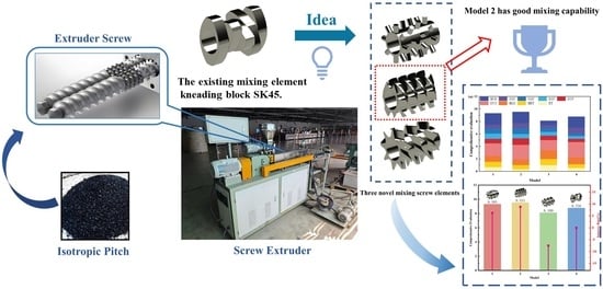 In recent years, there has been a growing shift toward the use of screw extruders in the pitch modification process. To further improve the mixing efficiency of twin-screw extruders in pitch processing, this study focuses on redesigning the mixing elements of a co-rotating