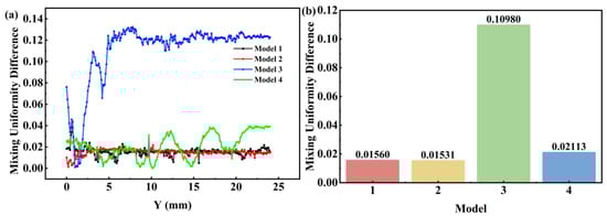 In recent years, there has been a growing shift toward the use of screw extruders in the pitch modification process. To further improve the mixing efficiency of twin-screw extruders in pitch processing, this study focuses on redesigning the mixing elements of a co-rotating twin-screw extruder. By integrating the conventional kneading block assembly with PTA technology, three innovative screw mixing elements were developed. In this study, numerical simulations were performed using the finite element method (FEM) in the ANSYS Polyflow 2022 R1 software. The dynamic mesh technique was employed to model the screw rotation. The mixing performance of these novel screw elements was then evaluated in terms of distribution, mixing, and shear effects by utilizing the Particle Tracking Analy sis (PTA) technique within the Polyflow statistical module. The results demonstrate that the configuration and structural design of the mixing screw elements significantly influence the mixing effectiveness of spinnable pitch. Among the tested configurations, the slotted thread mixing element with six slots and a 30° slot angle (Model 2) was identified as the optimal design, exhibiting markedly superior mixing performance compared to the traditional kneading block (Model 4).